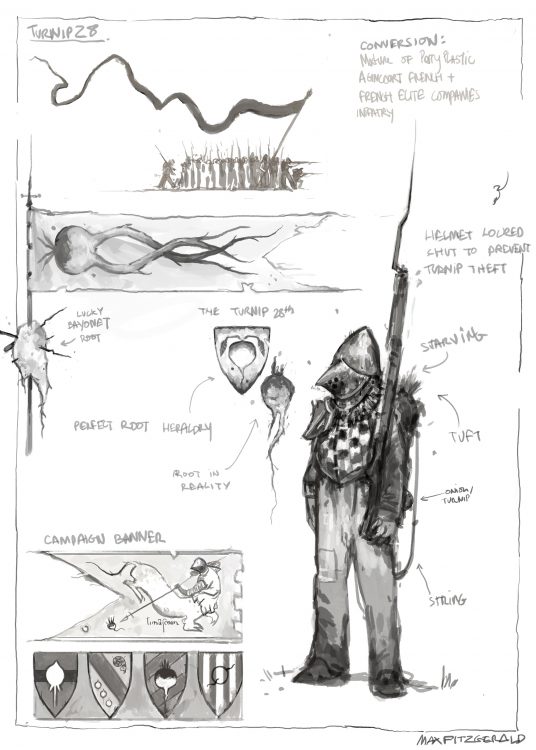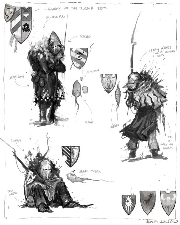 And I don’t know where the root vegetable thing came from. But it just seemed to fit. So I sort of designed them so they’re religious fanatics, trouncing through the mud, their helmets rusted shut, and then around them they’ve got sacred charms, tokens, and iconography of root vegetables. And there are these shriveled, disgusting… maybe semi alive?... roots growing around them and out of them. Maybe they’ve got one growing out of the slit in their visor, or they’ve got one full of nails stuck to their breastplate as a sort of lucky root vegetable to stop them being hit by musket balls.
