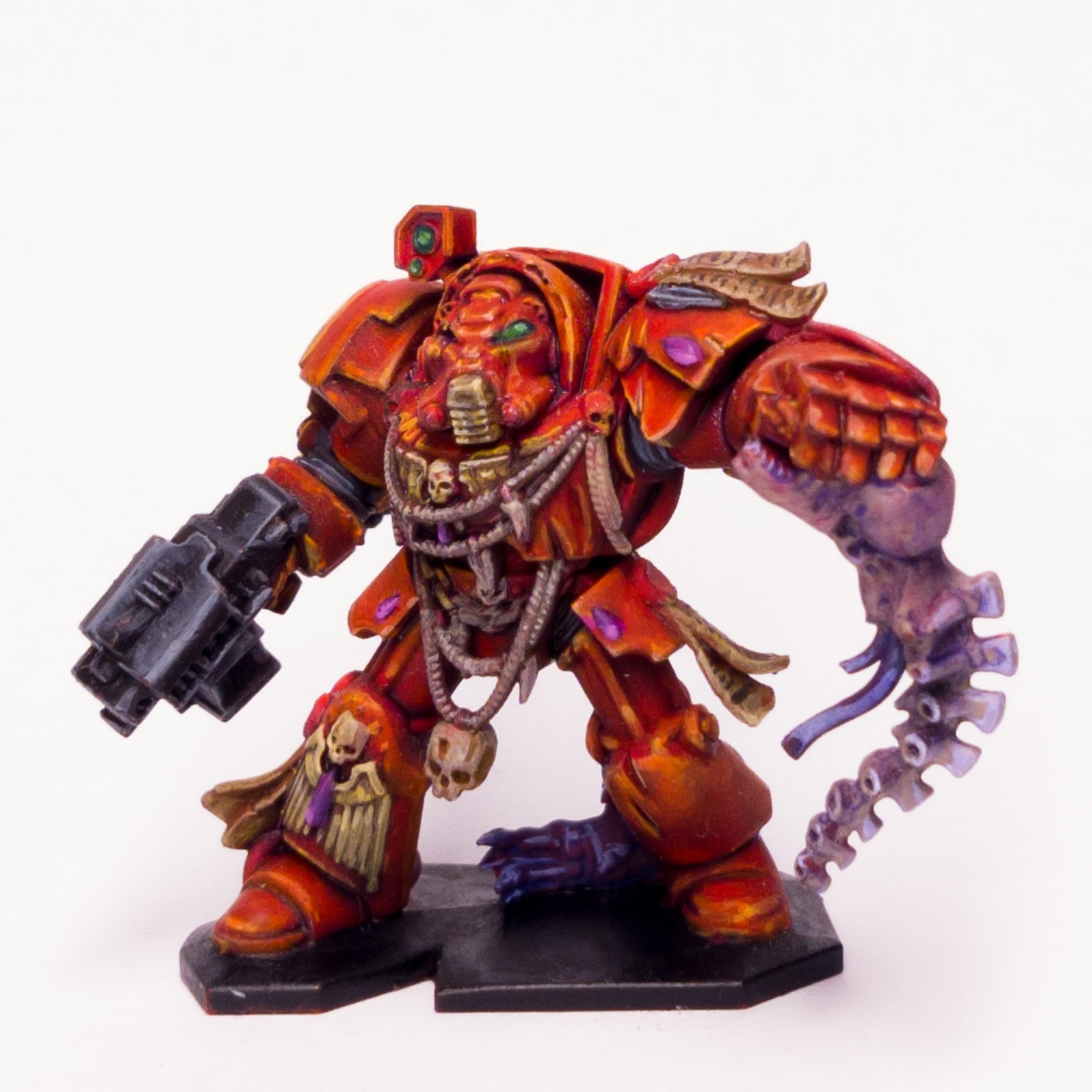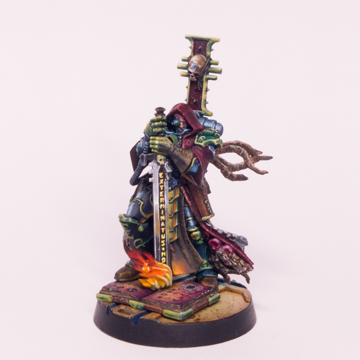Nerodine: I was inordinately pleased with the fact I managed to get some nice lighting effects on the Inquisitor and his sword, and he's stabbing a book in the model, which is kind of amazing. But I didn't like the way they'd being sculpted so I filled it all in, sanded it back, and then I painted it more as a chaotic tome so I could get more detailed on that. It's literally impossible to see unless you're sort of standing over it and you sort of tilt it and look at it from top down. But I was very pleased with that.