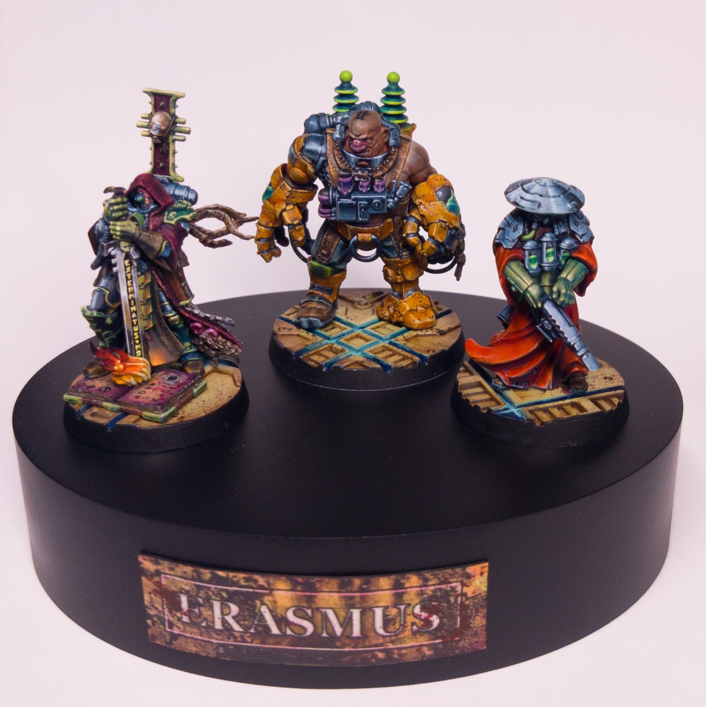 Nerodine: Sure. It's a three man Inquisitor and his retinue 40K squad. It's the Inquisitor Erasmus model, and I built a slave Ogryn from the Necromunda pack. And I got one of the hired guns from Necromunda. Made three of them. I actually planned to do five or six figures, but time, procrastination, deadlines, and trying to push the quality of the other ones meant that I ran out of time, so I just put them on simple bases and then put them in. But I tried to set a color palette, so one's more sort of yellow, one's more orange, one's more red, so you get a nice analogous color scheme between them. And then tried to create connecting points, so painted liquids on two of them in the same style so they tie together. The Ogryn's got an Inquisitor symbol tattoo on top of his head, so he ties back to the Inquisitor.