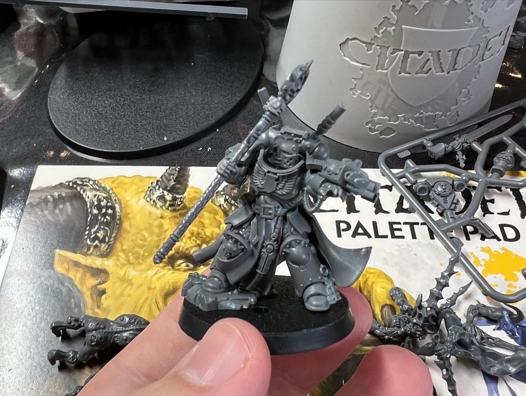 For mine I chose the Primaris Champion because I thought it would be easier to make a conversion off of and paint in time. I wanted to keep the scheme simple so I could finish it in a couple hours while giving a narrative. Sifting through the mountains of sprue I found a sprue of Plaguebearers and some Grey Knight bits; the duel became obvious. With a bit of cutting for simple arm swaps, a head swap and an interceptor backpack thrown on it was looking suitably Grey Knighty; I had put a Custode half-cape on it for a few min but that would take more painting time, so that came off.