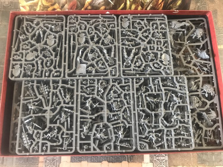 heavy, weighing in at a chunky 4kg, which puts it in a similar weight class to the original Kill Team starter set. Opening it up you find it's absolutely jam-packed with sprues; the sheer volume of plastic here is something to behold, and easily outmatches even last year's Indomitus box for 40k. If you're hoping for a hint as to what future releases recycling these will look like, by the way, here's a list of exactly how the contents are laid out: