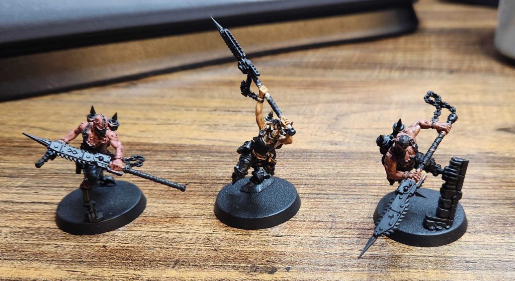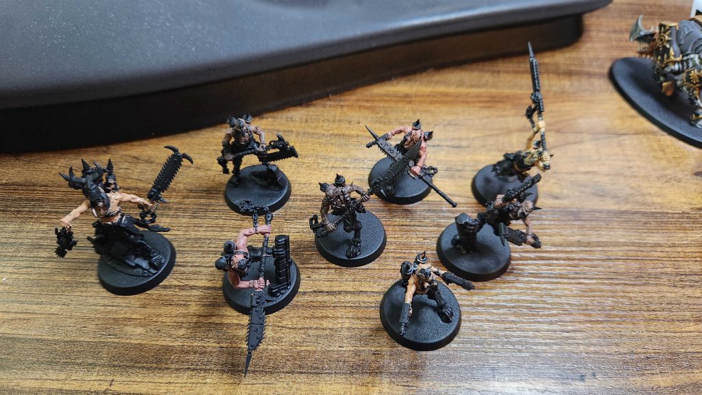 TheChirurgeon: Goremongers come in squads of eight models and they have surprisingly few options for a Kill Team. There are essentially four models with options, and because I was building my guys for 40k I mostly ignored them. Note that I have no idea what the rules for these guys will be in 40k, I just know that I am not going to be giving anyone guns for a unit that's largely going to be fighting in melee. So I kept the double lacerators for the Stalker and the big axe for the Skulltaker and just put standard chainglaives on everyone else.