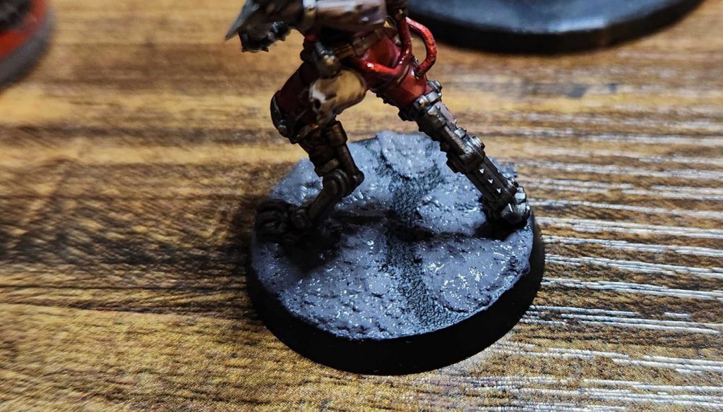 Finally, there were the bases. I wanted to do some blood river bases for these, so I based them with Astrogranite Debris texture paint, but did so in small islands, leaving clear channels between the sections where I wanted the blood. Once that dried, I drybrushed it with Celestra Gray and then painted in the space in-between with Gal Vorbak Red.