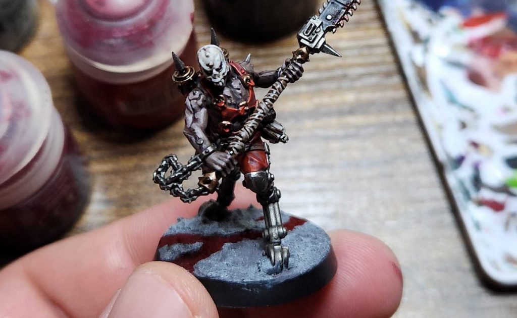 I need these to match my World Eaters, so their pants and leather shirts are based with Khorne Red, then highlighted with Mephiston Red and Evil Sunz Scarlet. The metal bits are Leadbelcher washed with Nuln Oil, the brass is Castellax Bronze washed with Agrax and highlighted with Sycorax Bronze. The bone is Rakarth Flesh washed with Agrax and highlighted with Rakarth Flesh again and Reaper Polished Bone.