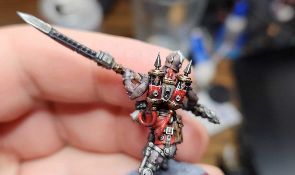 SRM: Painting them is a slightly more nuanced prospect than building them. The basic rank and file robed weirdos are genuinely pretty simple - a few different panels of fabric you’ll want to differentiate, a weapon or two, some skin and an ornamental doodad are really all there is to it. There aren’t even extra doodads on the sprues, so you can’t dress up your Keiths Flint with reliquaries and purity seals. However, the Missionaries carry a cross-country backpacking tour worth of stuff on them, and have a load of overlapping belts and trinkets. While I focused my own painting attention chiefly on those two, if I were trying to get the whole crew painted for this article they would definitely represent the bulk of my painting time. The cherub also looks like a tiny Guy Fieri.
