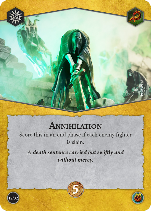 even if your opponent isn't playing around it. It's not uncommon for an aggressive warband with two aggressive decks to make 12 attacks in a game and still not table the opponent. Can it happen? Of course. It does require finesse and a bit of luck, but the reward is pretty massive. If the opponent knows it is in your deck, they are highly incentivized to do everything in their power to run away. That can interfere with their game plan, but at the point where Annihilation is on the table, their game plan is typically in a rough spot anyway.