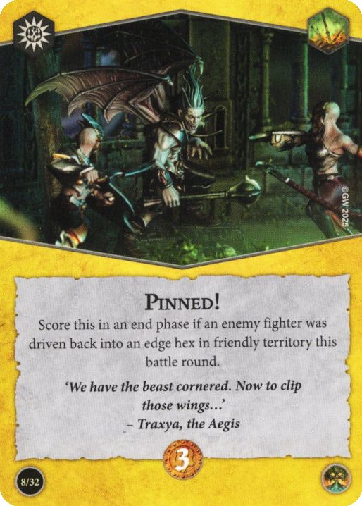 also happens to be a rather small sample size of two. That said, if your opponent wants to be on your side of the board for any reason (e.g. any of the multiple objectives that require it, treasure tokens in your territory, your Aqua Ghyranis token) then it does a surprisingly good job at restricting the "safe" areas they can be. Your opponent has to stay out of all the edge hexes as well as the hexes adjacent to edge hexes if they don't want to give you this for low effort. There are 40 friendly territory hexes when the board is oriented in 5s; 38 when it's oriented in 9s. This is actually quite a substantial reduction in the number of "safe" hexes they can stand on in your territory – 14 in 5s orientation and 13 in 9s. There are ploys and upgrades that can help this score – one of which is already in the same deck – but it does require more setup than some of these other objectives.
