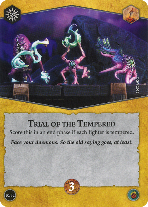 Trial of the Tempered was in 4 of 6 decks. Trial is yet another polarizing objective on this list in terms of how easy to score it will be. Against a horde of pre-tempered fighters like the Grymwatch or Thorns of the Briar Queen, it's going to be fairly straightforward. Against a warband with high health fighters like Morgok or the Emberwatch, it will require spreading out damage across multiple fighters which often isn't ideal. Sigmar help you if you're up against something with multiple non-tempered fighters