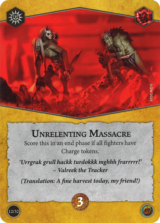 Once your opponents' skill level and familiarity with the game starts to increase, they are now aware of these cards and actively try to deny you from scoring them. Whether this is standing on a treasure token to deny Strip the Realm or simply not charging with all of their fighters to deny Unrelenting Massacre, players at this level have realized that making a sacrifice to their own game plan can brick a very high scoring objective in their opponent's hand and be worthwhile.
