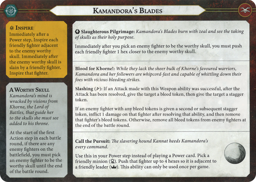 This was a hard earned lesson. Despite being an aggressive warband with an aggressive deck setup, the Blades are just not durable enough to recklessly throw into the enemy. I went far too aggressive with early rushing that wound up inspiring most of the ghosts because I wasn't capable of one-shotting them. That lead to Kamandora and her crew getting repeatedly attacked by damage 2 surrounded attacks which quickly overwhelmed my Khorne fighters. Reckless Fury is a deck that rewards charging and I was finding that with the worthy skulls push, I didn't always need to charge and would rather get multiple attacks out of one good (and inspired) fighter instead.