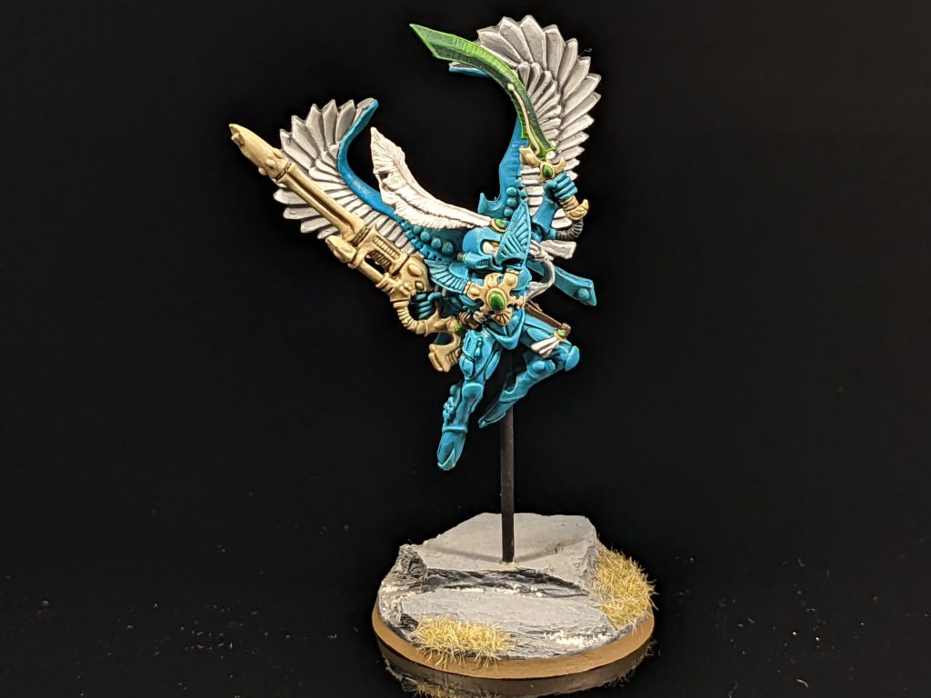 Clocking in with a hilarious four separate guns, the Farseer Skyrunner rides into battle like an arcane mall ninja. He’s got the spear (or Witchblade), pistol, and Eldritch Storm from the walking version, but also picks up a twin Shuriken Catapult that I once had take the last wound from Belakor. Adding him to a unit of Windriders does give him full rerolls to hit against units on objectives, which is occasionally really useful.