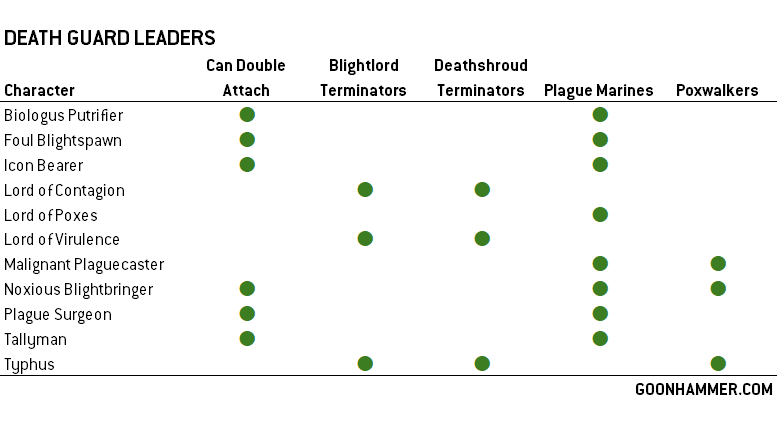 These have been shaken up a bit since the Index days. First off, there's a clear distinction here between your Plague Marine and Terminator options which, no surprise, is dictated by the armor worn by the Leader. This means that only Plague Marines have access to the characters who can double up (these used to be referred to as "Foetid Virion"). The big outlier here are Poxwalkers, who could be joined by Typhus, and who gained the ability to be joined by a Malignant Plaguecaster or a Noxious Blightbringer, both of which are interesting options.