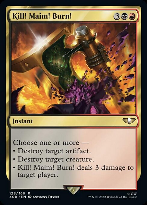 Rocco Gest: I like flavor of this card. Destroy creature (kill), deal 3 damage (maim), destroy artifact (burn). Too bad they had to list the modes alphabetically.
