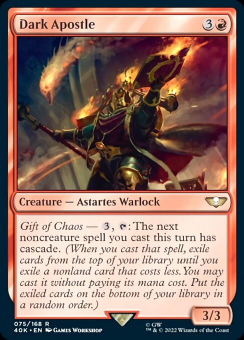 BPhillipYork: This dude is suspiciously close to Yidris, though not requiring him to attack is a big deal. 5 mana is probably easier than UBRG to generate. I've heard the argument Abaddon should have UBRG in his colors (1 for each chaos color), and honestly, the similarity to Yidis is probably the reason. You can definitely build a whole deck around cascading out your whole deck, there's a particularly fun interaction to be had with