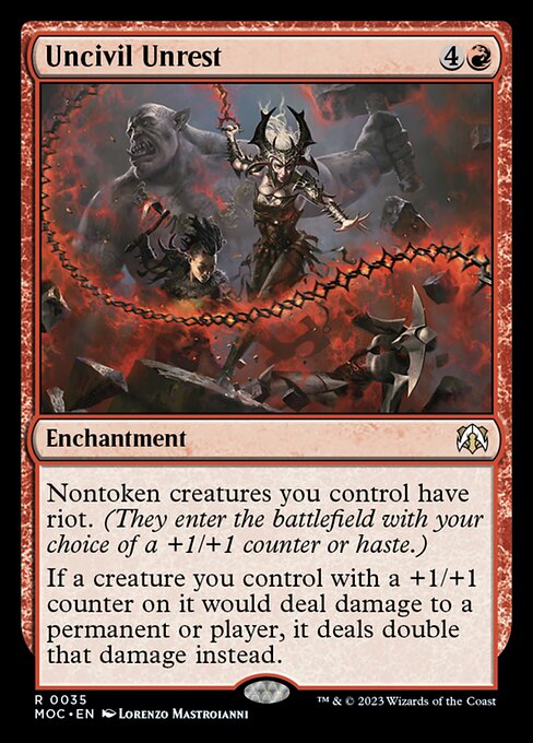 BPhillipYork: This is pretty solid. Expensive, but riot for mon-red is really, really nice. Combine that with a damage doubler for +1/+1 counters and that's an extremely solid card to pump your creatures and give haste. It's also not