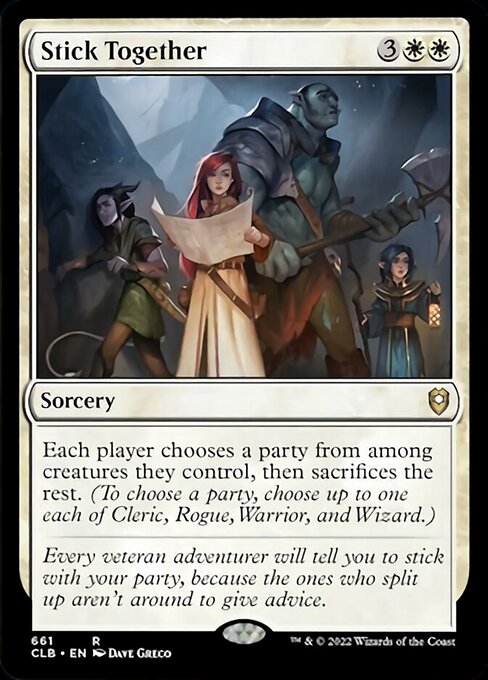 Stick Together is at least a bit more on theme and an interesting card, potentially quite good because it's a sacrifice effect as opposed to destroy, where you could dodge it by maintaining a party, but it feels like it's always going to hurt the deck a fair amount, counting on wrath + indestructible seems a lot more dependable, even if opponents creatures will occasionally also be able to dodge it.