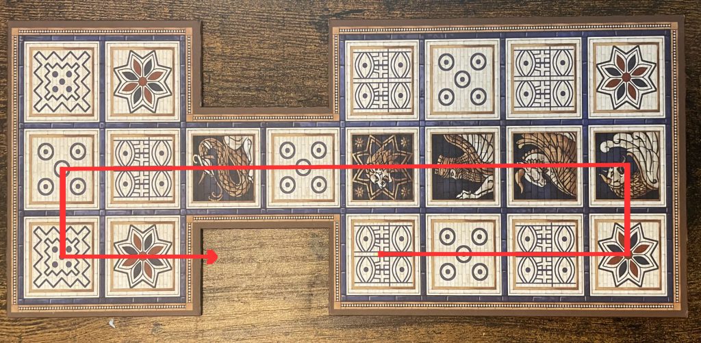 Other suggested tracks are slightly more complicated, possibly navigating around the initial 3x2 area before moving down the central path and around the 3x4. I've played Ur like this and if I'm honest, it makes it a very long, slightly tedious game!