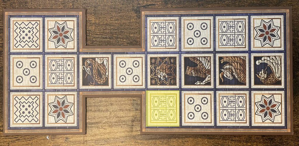 Enter our other strategic points, the tiles of Ishtar and Marduk. Ishtar, the Goddess of Love, War and Fertility (what a collection of things to be God of, eh?) owns the most powerful tile in the game, and one that presents a pressing strategic need. Hold Ishtar and your forts can't be captured - but the Ishtar tile is still vulnerable. With only 7 pieces at your disposal, holding all four forts and Ishtar is tricky, but possible; you'll need to outmanoever and outthink your opponent to keep it. Fitting for the Goddess of War! Marduk, patron God of Babylon itself, allows you - or your wily opponent - to set up ambushes and unexpected moves, acting as an entrance tile far up the board, bypassing a long and potentially dangerous slog up through the entrance tracks. Combining both tiles gives you a strategic point that you absolutely must seize and hold - Ishtar - and a way to do it when your opponent least expects it.