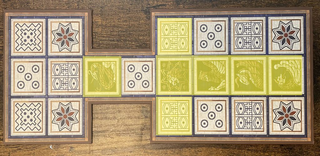 With a new ruleset comes new interpretations of the tiles. In this version, the Rosette forts are the victory condition - hold all four Rosettes and you win the game. Positioning is therefore all-important, particularly if the classic rules are wedged in your head and you lose most of the review games through thinking you're aiming to get pieces off the board (but who could possibly be daft enough to do that?). Holding forts in "Heaven" (the 3x2 section of the board) or "Earth" (the 3x4 section) grants you bonuses to your movement as well, so it isn't quite all-or-nothing. Making an early play for one board section certainly makes your game easier, but it doesn't guarantee you a victory for one important reason - pieces on forts can still be captured.