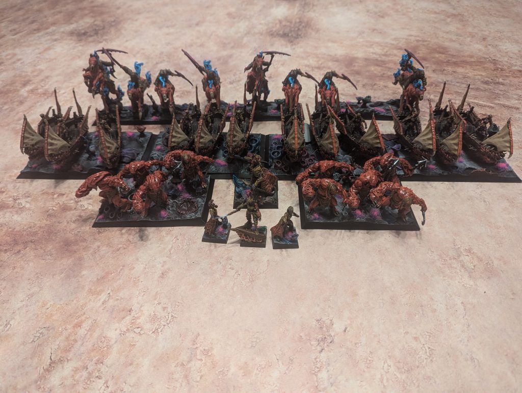 This version functions with a core of two Ravager hordes to shoot off anything that gets close, while Enthrall and Wind Blast shenanigans from the Soulflayers and Crones/La’theal keep things safe. The Piercing 1 damage rolls on those spells for the Crones is bonkers good. The Ravager’s shots can be a little swingy, but adding in what is effectively another 15 shots, with the potential to be elite thanks to La’theal’s Rule (Name), really locks in on killing whatever you want (provided it is not carrying a token!).