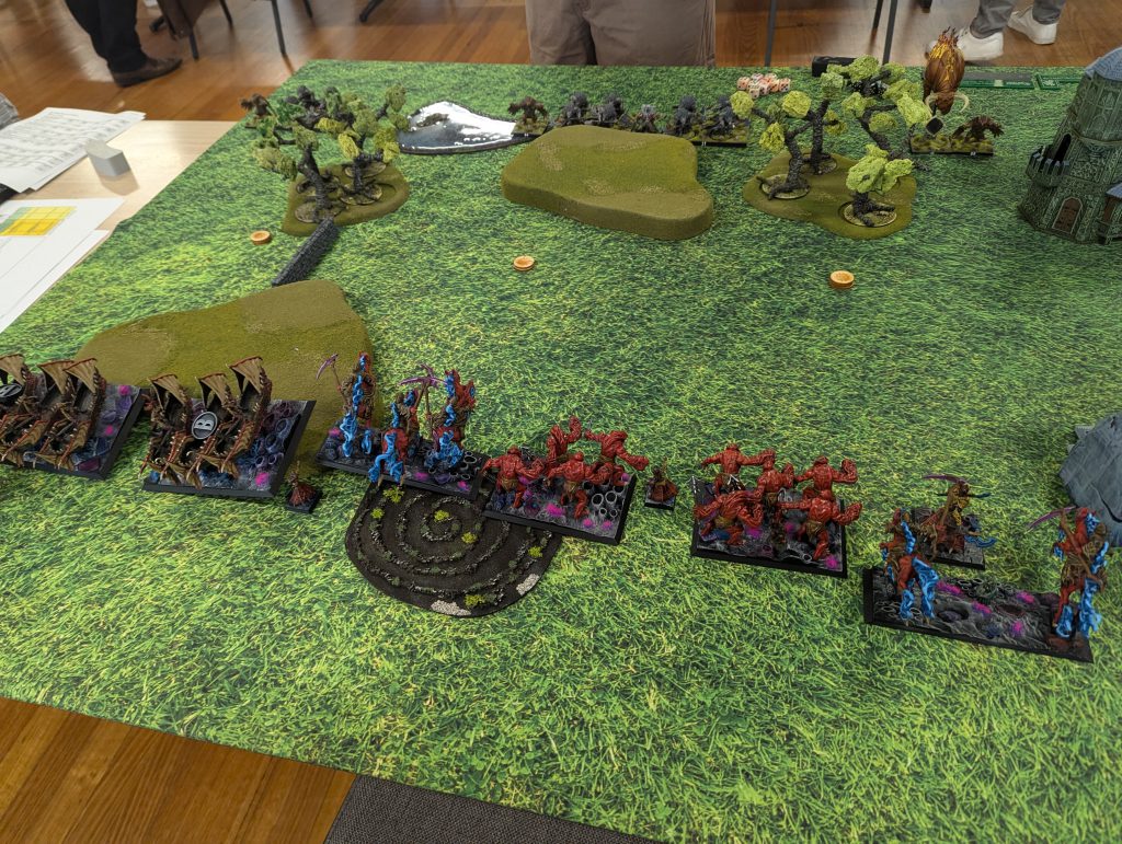 After a quick stop at Macca’s for a big coffee, day two sees me lined up into Viv's Forces of the Abyss. This one will be tricky. While the Moloch hordes are exactly the sort of unit I want to be shooting into, that Seductress with the Gnome-Glass Shield is going to be very annoying for me to deal with, and can easily shut down one of the Ravager hordes for two or more turns.