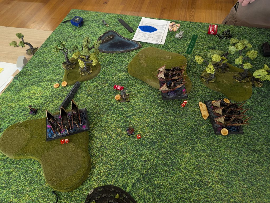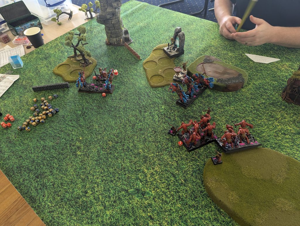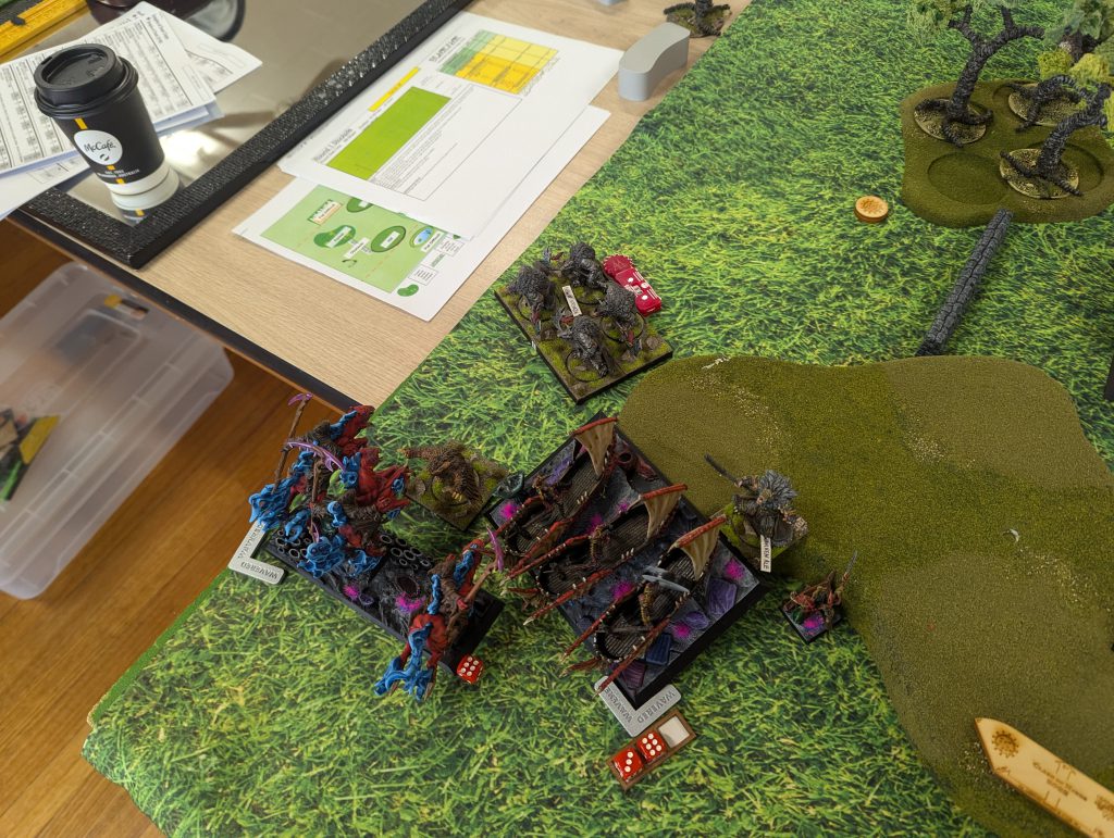 I’ve got my tokens on the Soulbane, and two Soulflayers (one to the left of the deployment pic above). Rex has his on Golloch, the horde on the far right, and on the rear central horde.