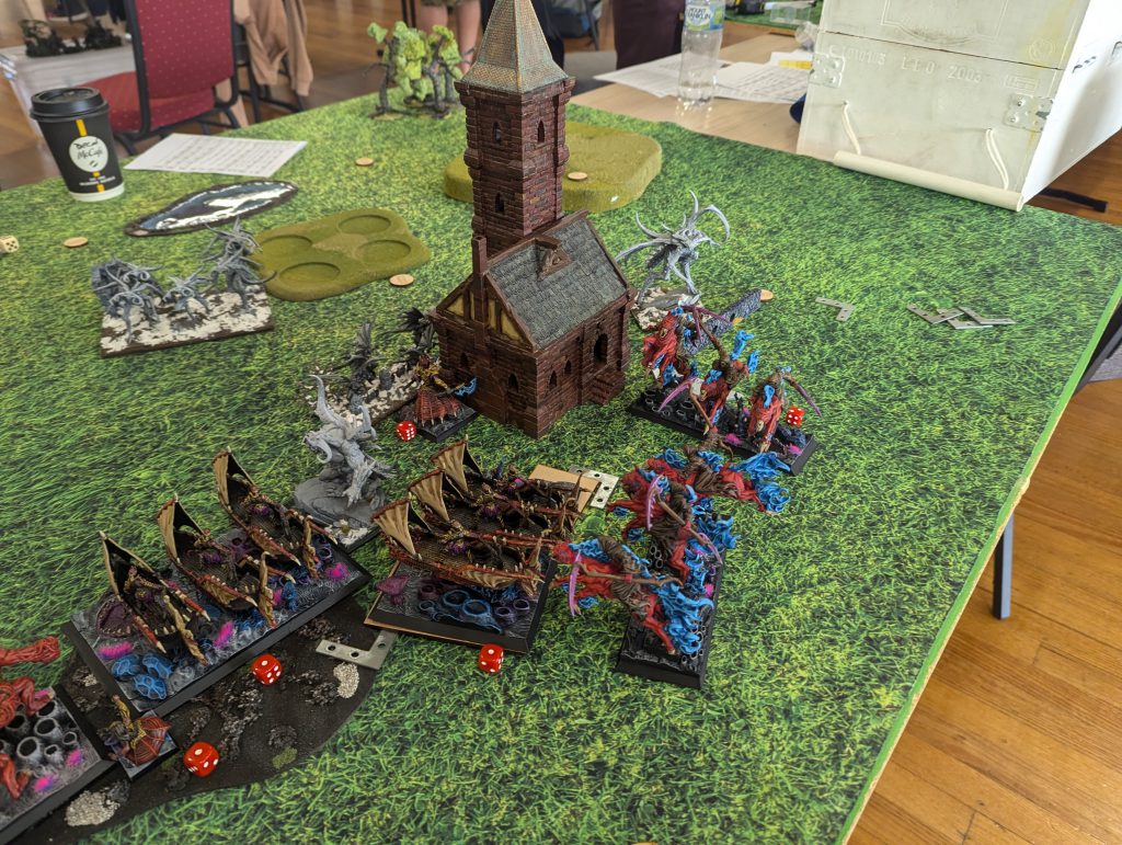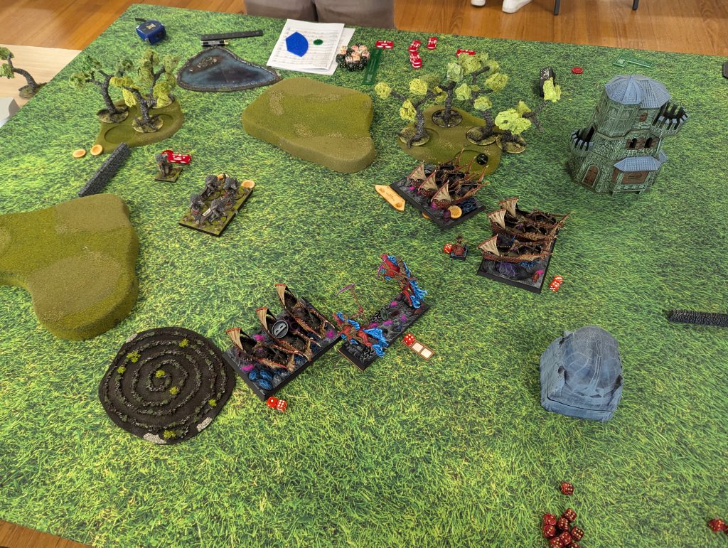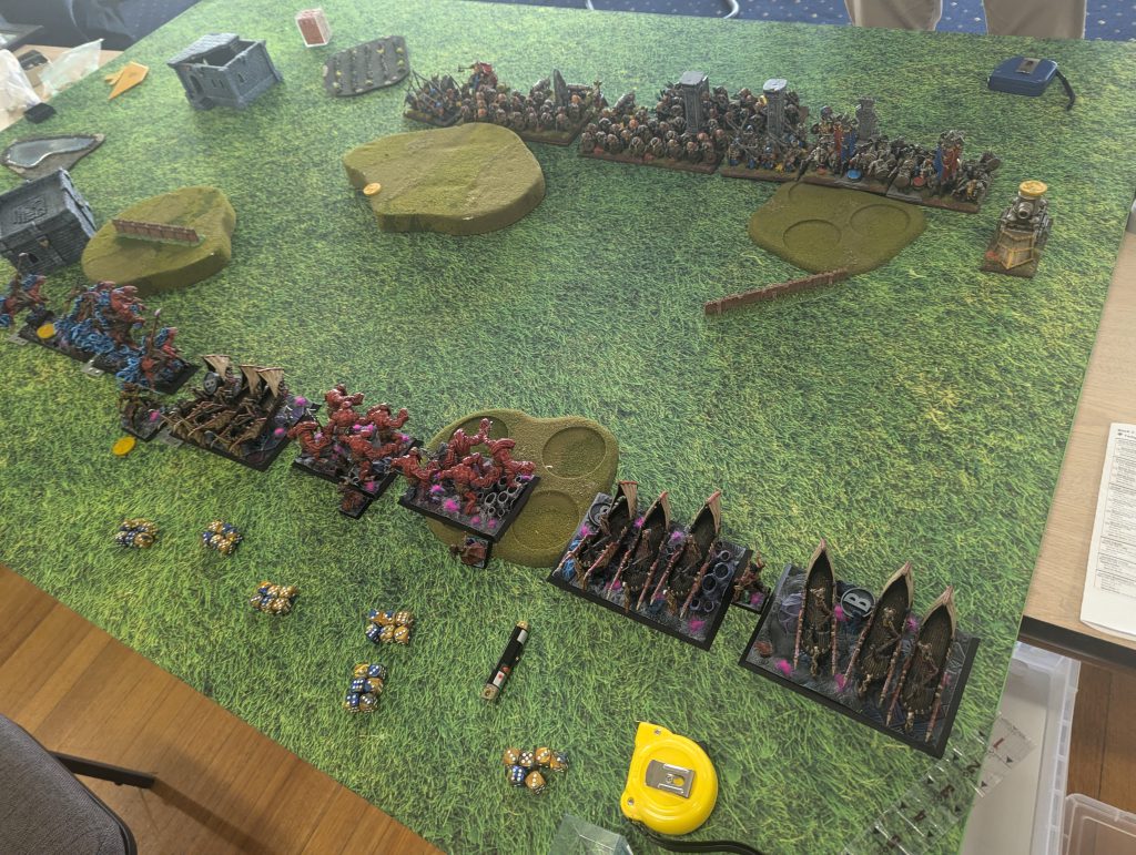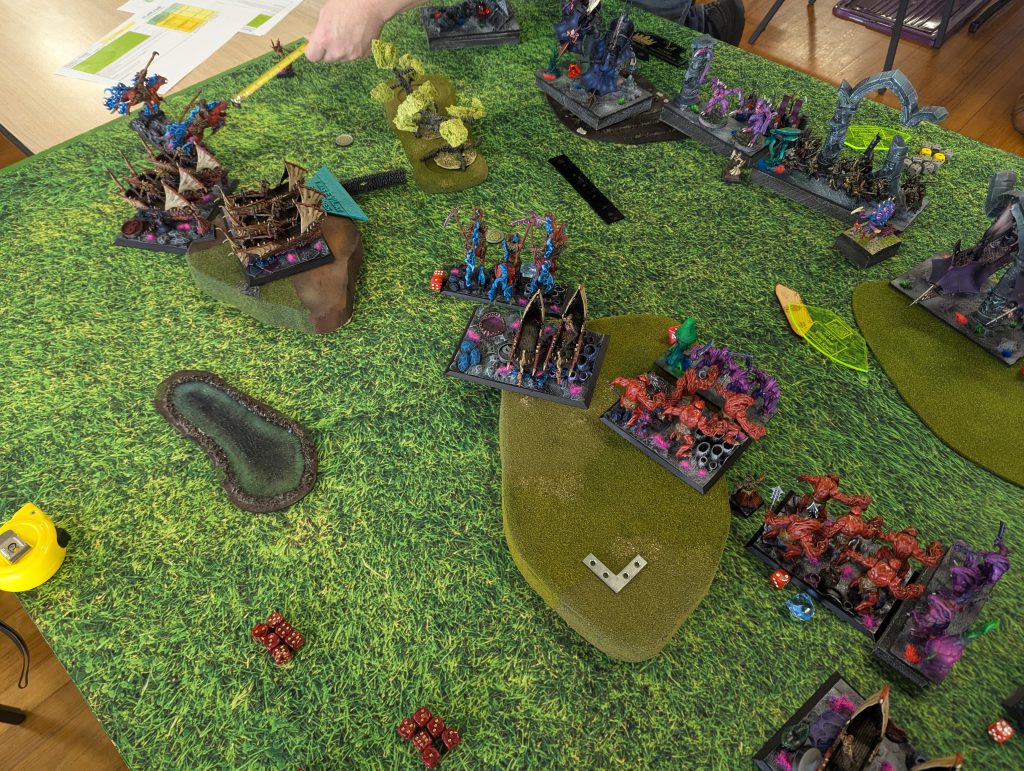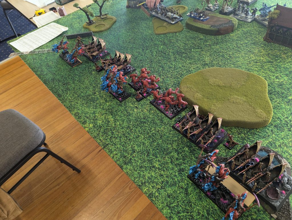 I get the first turn, and push up on both sides. I get a little cocky on the left, popping some Skiffs further forward than they need to be, and not popping their Blood Hex, so Ozzy just goes in. One unit goes down, and the other is moderately wounded after a bit of a low roll.