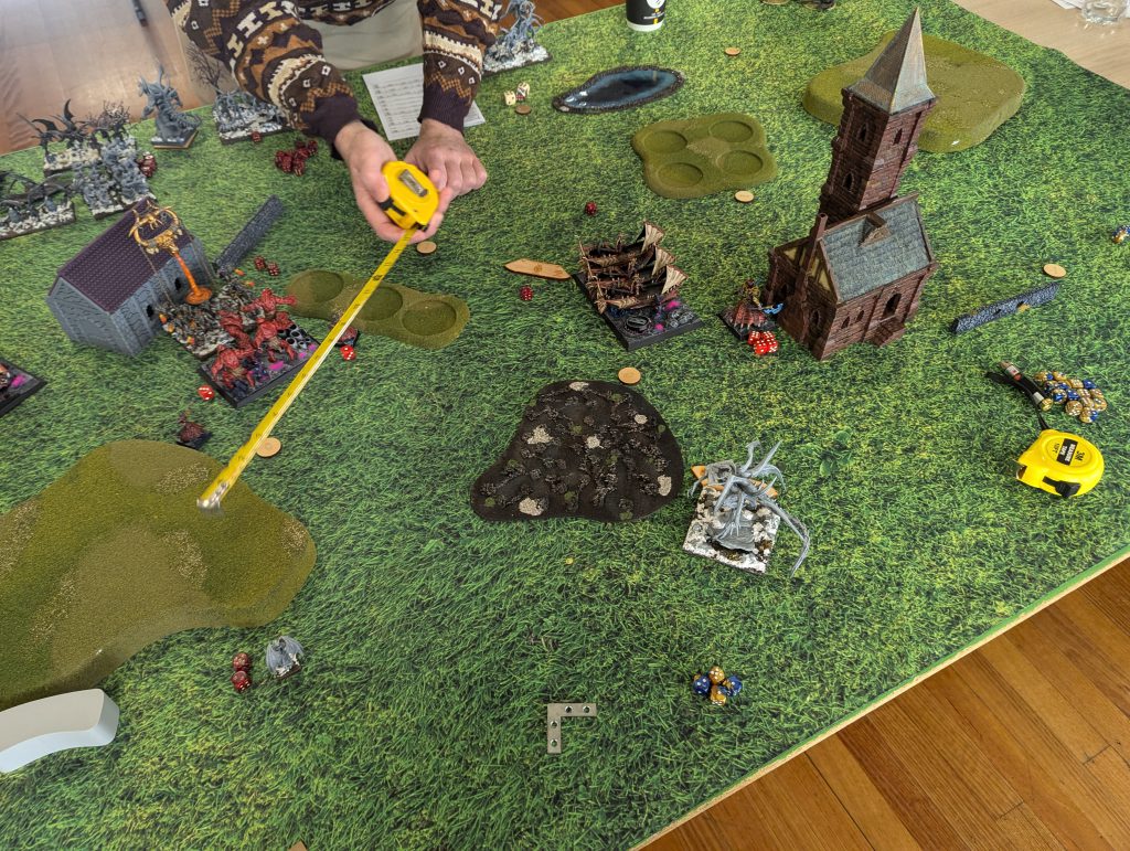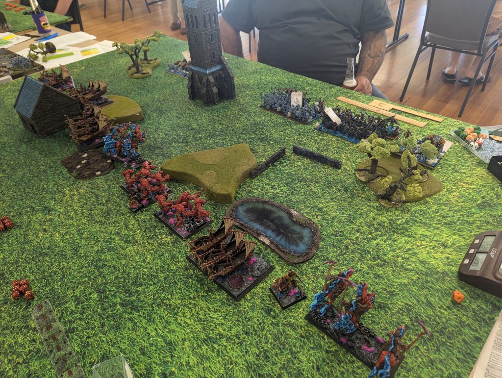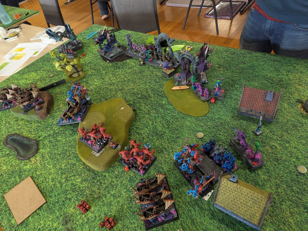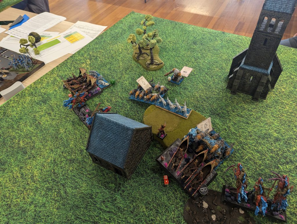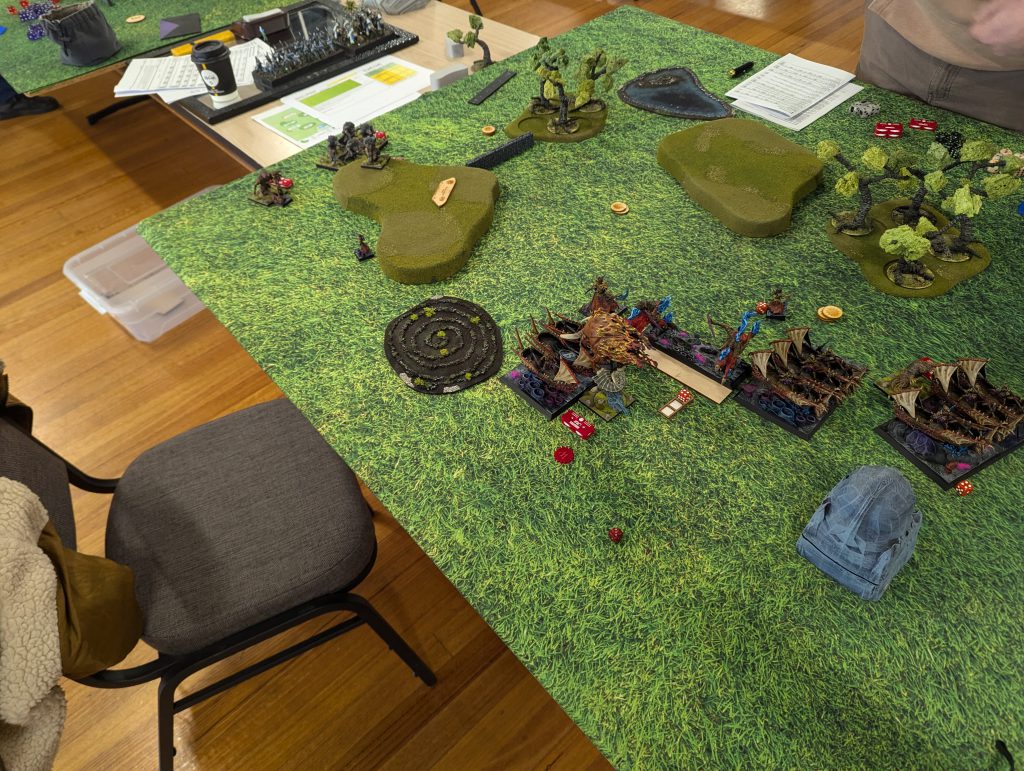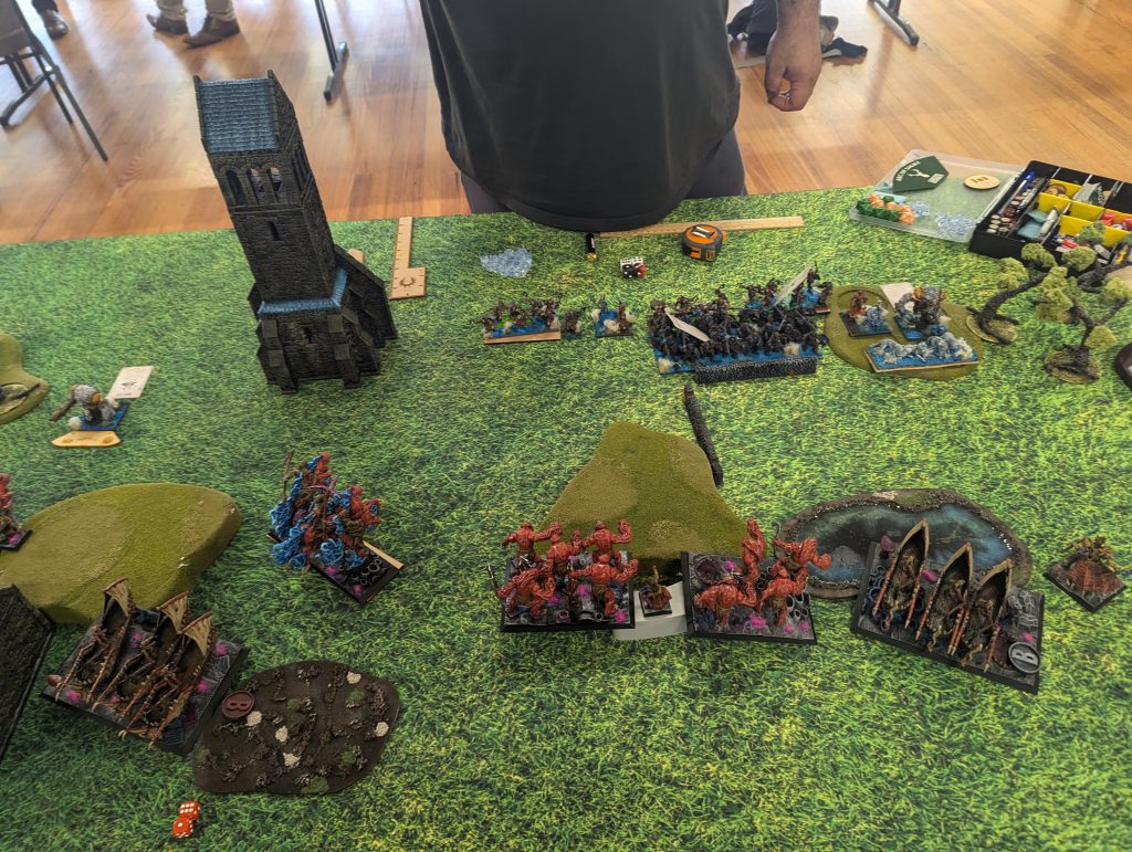 I get the first turn, and push up on both sides. I get a little cocky on the left, popping some Skiffs further forward than they need to be, and not popping their Blood Hex, so Ozzy just goes in. One unit goes down, and the other is moderately wounded after a bit of a low roll.