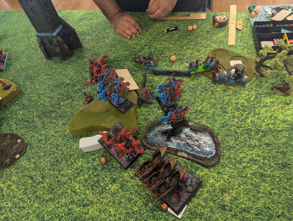 The Dwarfs on the hill keep pushing into me, so one Soulflayer has to drop its token, and jump over the hordes to charge the Flame Belcher on the hill, killing one and blocking LoS to my other token carrying Soulflayer on that side. Lots of things are being thrown at the wall on that side to keep those Soulflayers alive. The Skiffs even have to take a charge right into the pikes to stop both them and the horde reaching the tokens.
