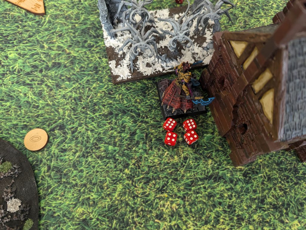 Over the rest of the game, the Beast of Nature trapped on the left finally kills the Void Captain, and then the Crone rolls a twelve after some damage and takes him off. The Lycan Alpha going after the tokens gets wavered by shooting, and tries to run back to grab some safer tokens, while the last of the Lycans come forward to meet their inevitable doom.