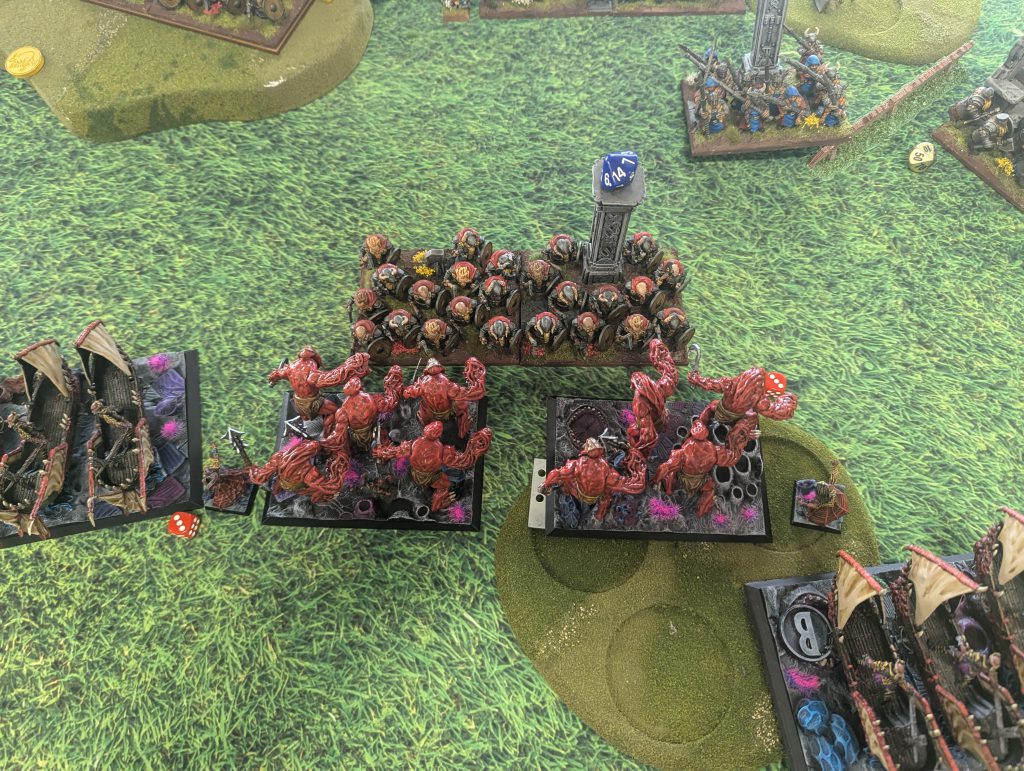 The middle horde without the token are devastated, but I snakes them. Fortunately, dwarfs are slow, and backing up before shooting still keeps them out of charge range, so it doesn’t cost me immediately. It does mean that the fresh horde carrying the token cop one less round of shooting, but some frankly astounding luck sees a double Ravager charge, one hindered and the other Bane Chanted, take out the horde in one go, and claiming me it's token, also crossing the line.