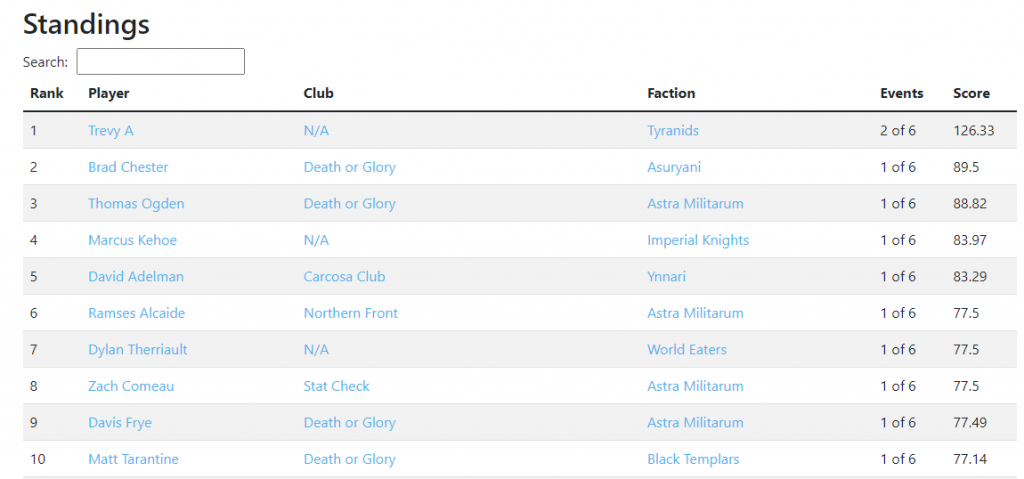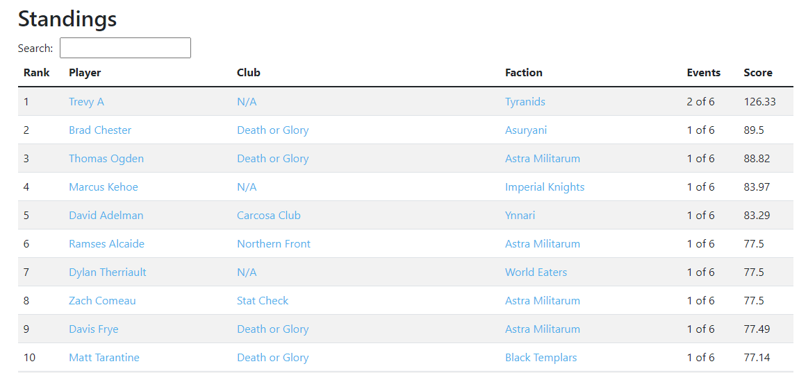 That's right, our standings are now live and available for public viewing for Warhammer 40k. You can view them by heading over