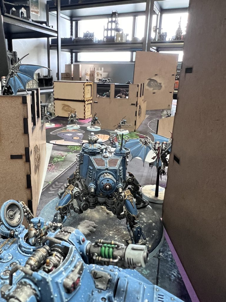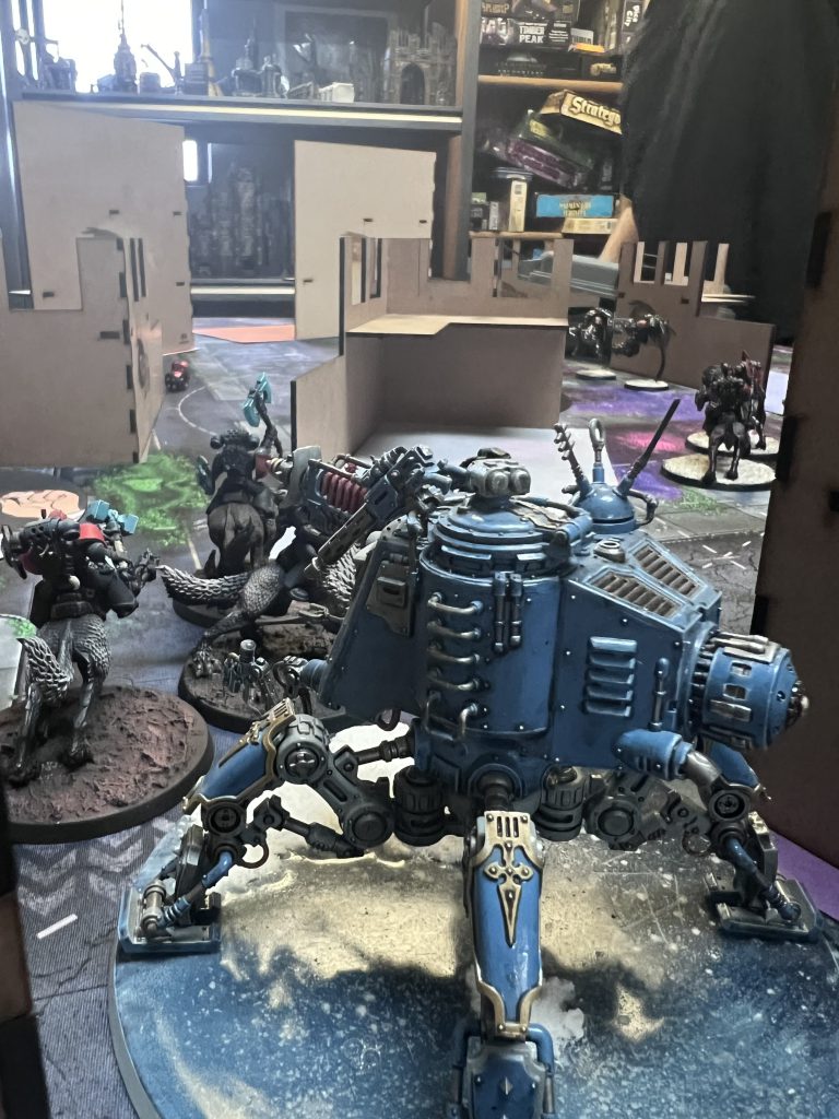 Space Wolf round one saw the left flank cavalry unit lope over the still-sparking bodies of the infiltrators and head straight into the unfinished second line of defense, murdering the Skystalkers as well while two units of Wulfen come through the gap left by the slain infiltrators in order to assault the Sterylizors and Skystalkers in center-field. The center unit of wolves moved forward into the infiltrators in their way as a third unit utilizes the Hunter’s Instincts enhancement to come in from reserves on the right flank, and use the Shock Assault stratagem to tear into the Skitarii on the nearby objective; eliminating all of the Admech player’s planned screens in the first round of play. The remaining time of the game was left to both players attempting to rack up as many points as possible, with the Space Wolves padding a victory, and Admech simply trying to up their score as skitarii are slaughtered by the Wolf Jail and are only able to put up token resistance by slaying the Wulfen and the Gladiator Lancer in an attempt at secondaries and delaying the inevitable.