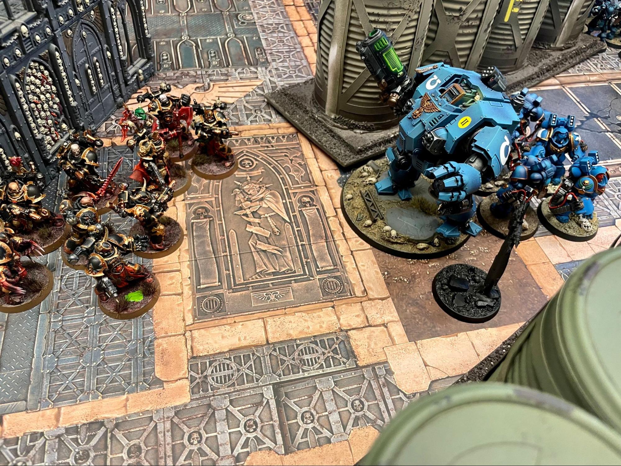 A Redemptor Dreadnought of the Sons of Ash 3rd Company engages an unknown possessed war machine in Kephistrone’s trench network. Photo: Andrew Corban