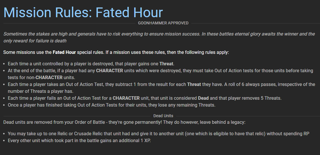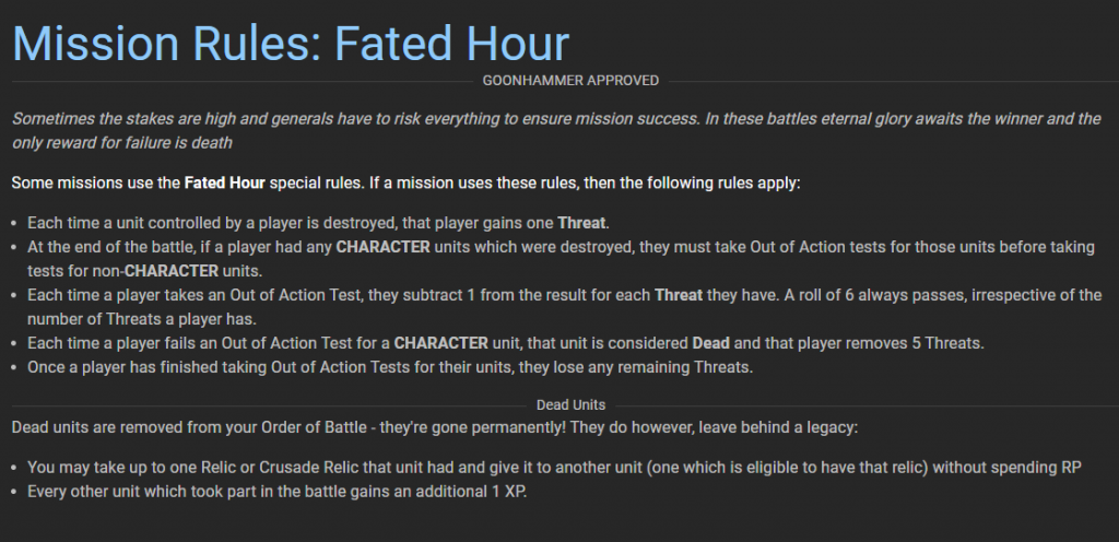 I love that Crusade gives you a way to avoid death. But sometimes that robs all the tension from key games and narrative arcs. Enter Fated Hours - these are missions where the stakes are high and only the strongest will survive. Each time players play a mission with the Fated Hour rules, they have a chance to lose their characters permanently, and the chances of that happening will go up with every unit which dies. It's a big risk, but the missions it shows up in will typically have big rewards...