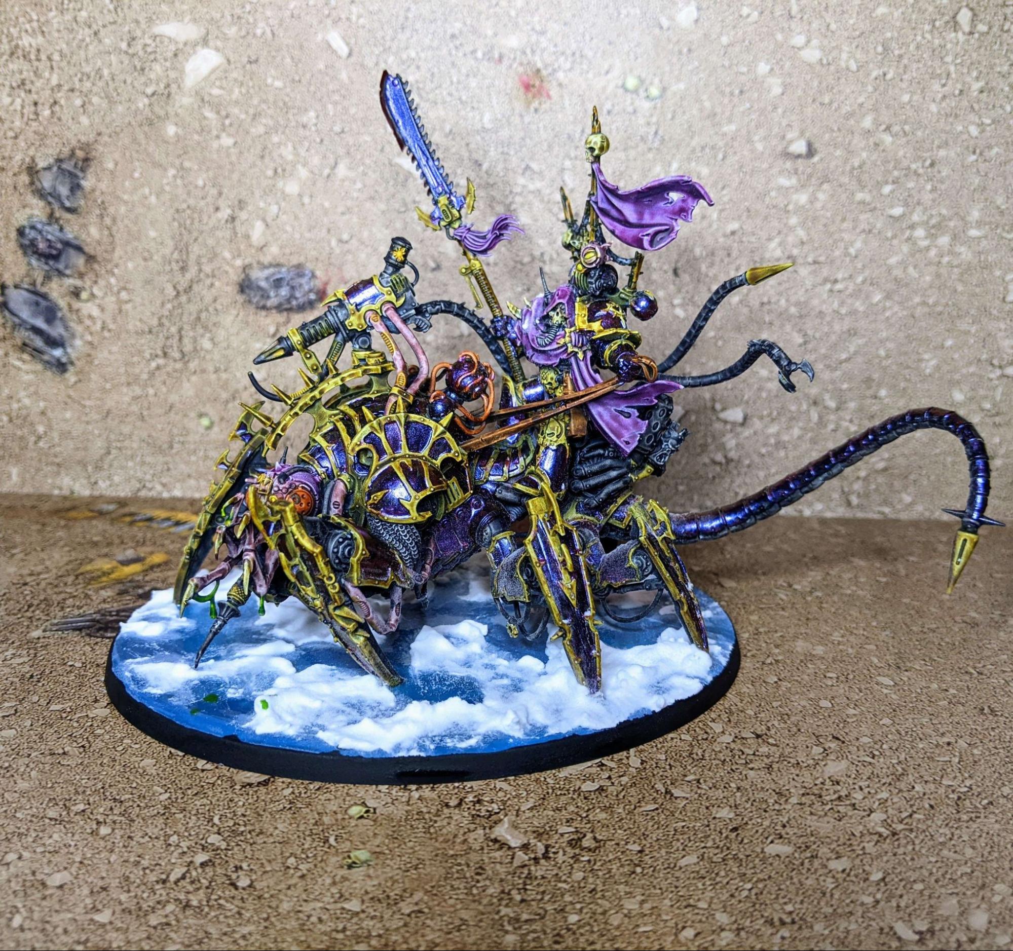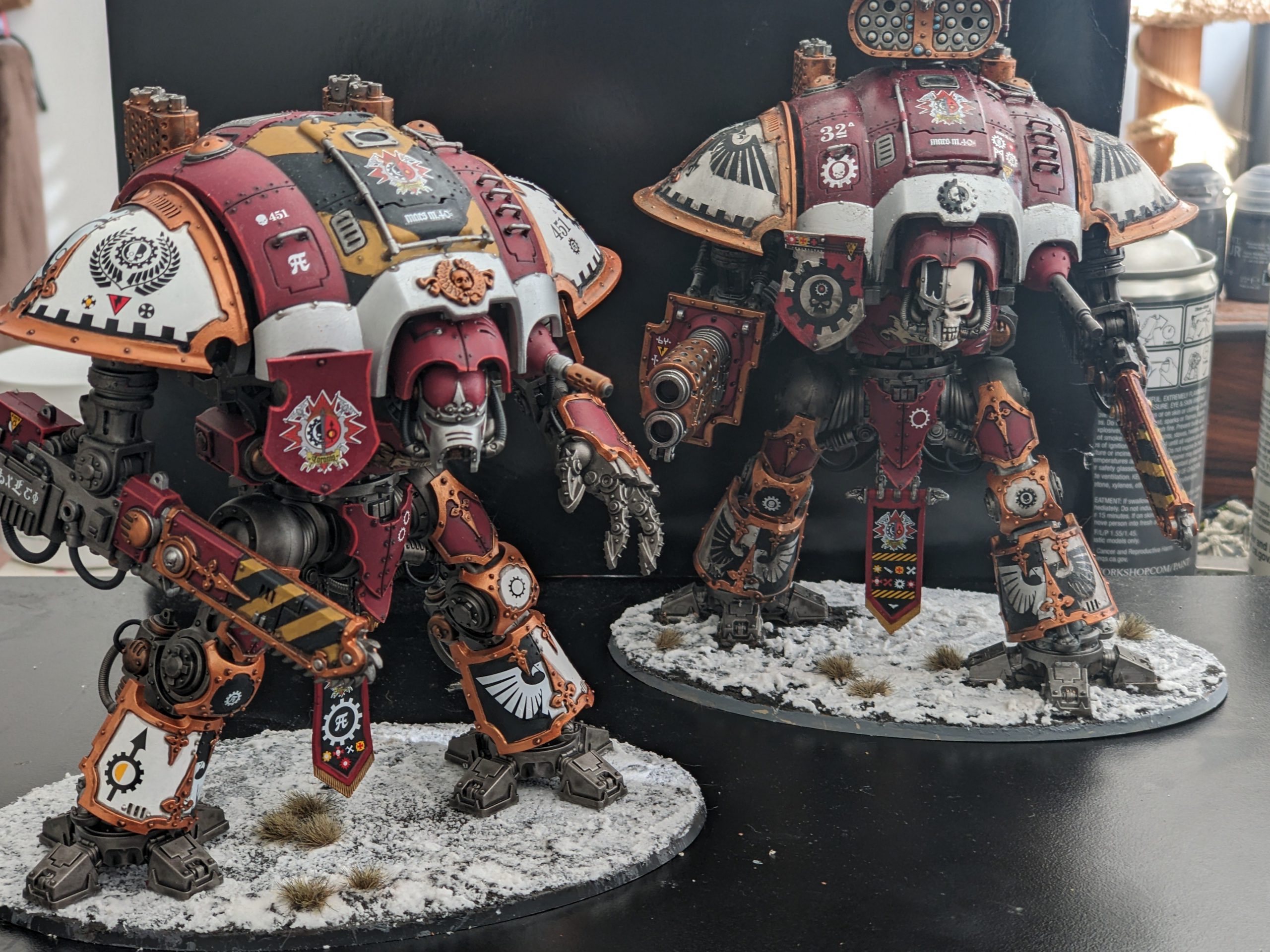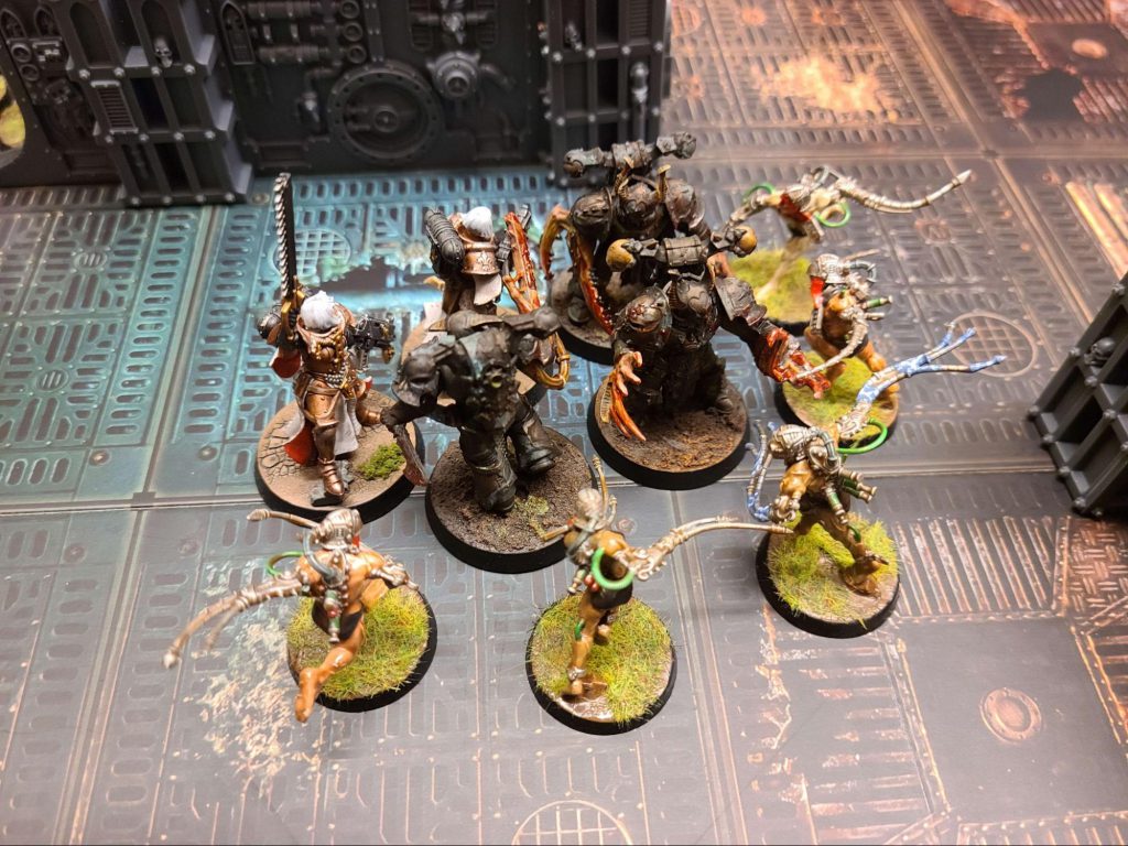 I made planetfall after undergoing trials imposed on me by Khorne. Landing in the mountains I quickly came upon Aeldari scum. Now stop my Juggernaut “Quick Bleed” I brought forth more warriors together from my legion. The transports were far behind but such logistical matters escape when the nails tick. Alongside a group of House Khomentis knights we could deal with these xenos scum. Quick as we arrived the xenos were on us. Howling ladies taking down the big knight as it exploded In glorious clouds of smoke and fire. I pushed my steed forward killing the shrinking women. They are no match for may axe, “Hope’s end.” I pushed my forces forward as they rallied to my leadership. The nails were singing a fine song. The eight bloody steps surged forth far beyond my reach killing any they came in contact with. Berserkers of the “12th’s fury Executed my flanking orders and killed a tank and other Aeldari scum. The knights began to fall around us as my mortal followers were shot down. I charged into spider-like creatures who thought they could get away but my speed is too deadly. The nails tick. Alas slaughter was plentiful and many worthy skulls collected for harvest but with our allies falling, I ordered a retreat. The nails punished me for it but I maintained control. For now they live to fight but our might and presence has been announced. Soon this world will drown in Blood.