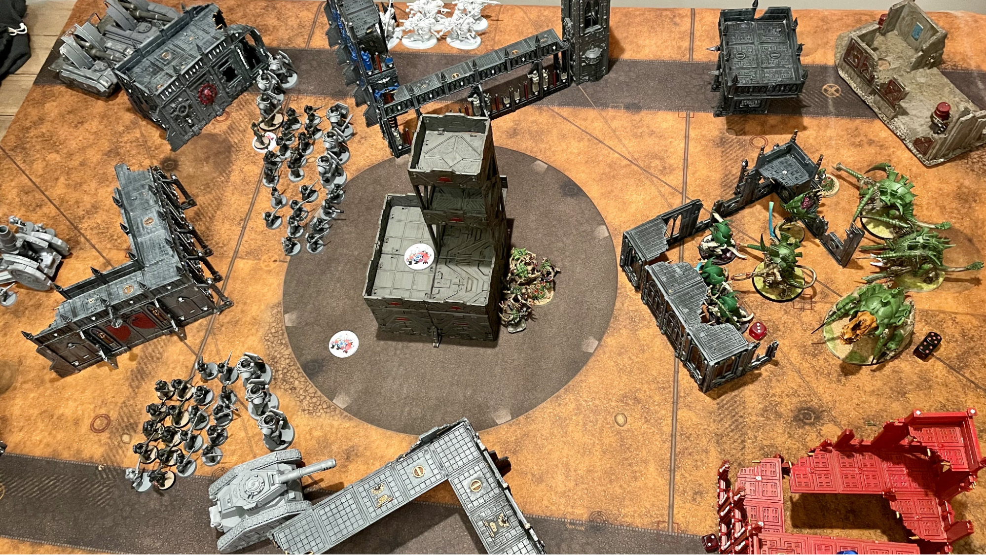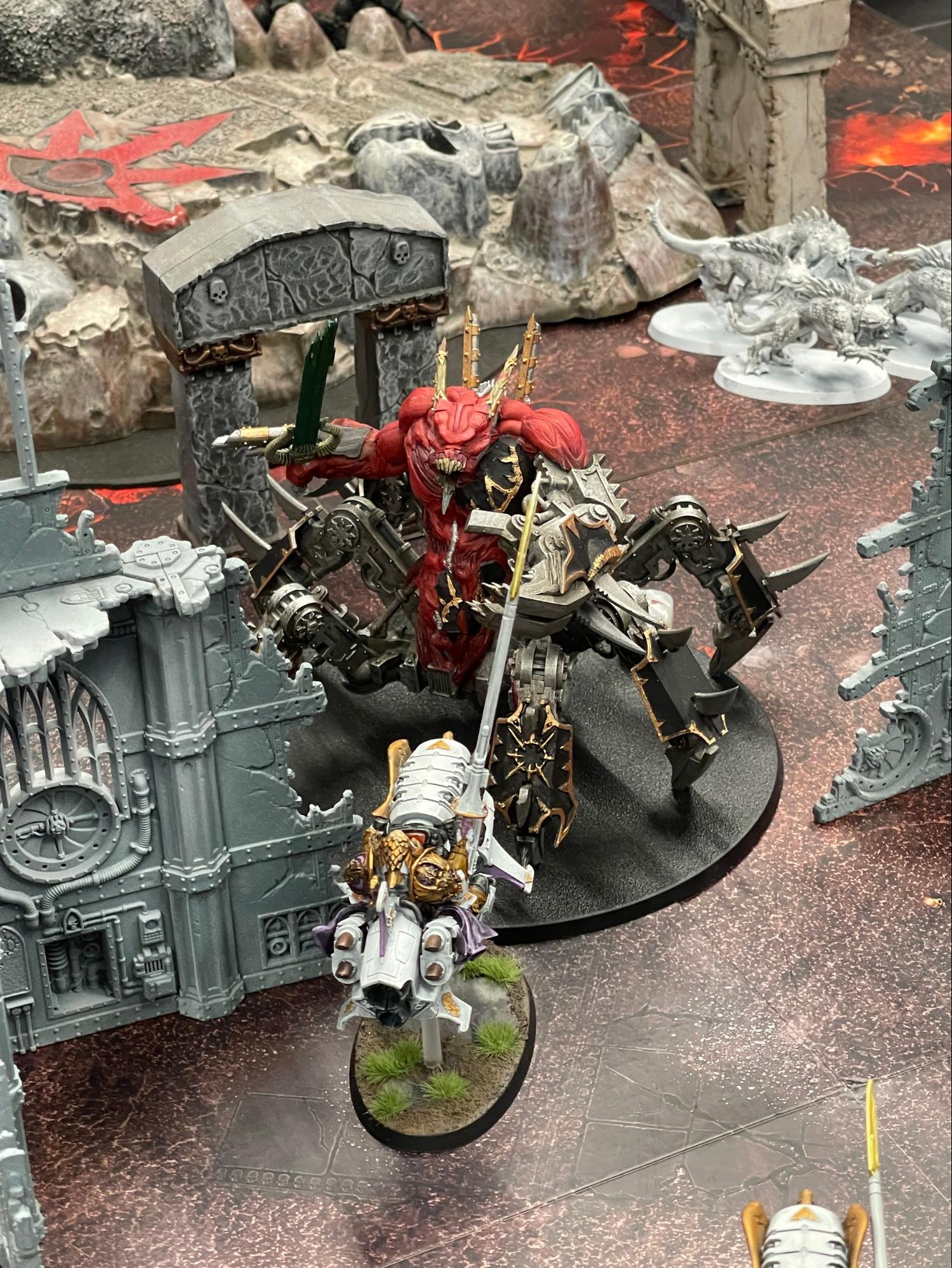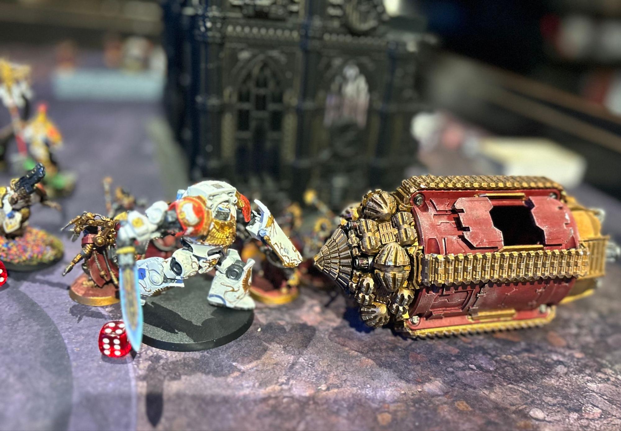 On the west flank the Tome Keepers squared off against the Septet of Sewage, with their droning poems and the chanting of the ritual being blasted over their vox speakers. On the east flank, the Crimson Defenders brought to bear their heaviest tanks against the horde of Daemons of Khorne, with tank commander Cody at the helm of his Shadowsword. In the center, the Custodes strike force “Sol Operis” took point against all three, using their speed to try and pin the armies of Chaos.
