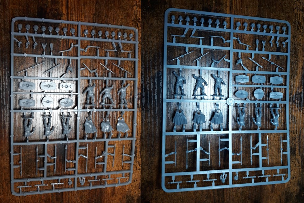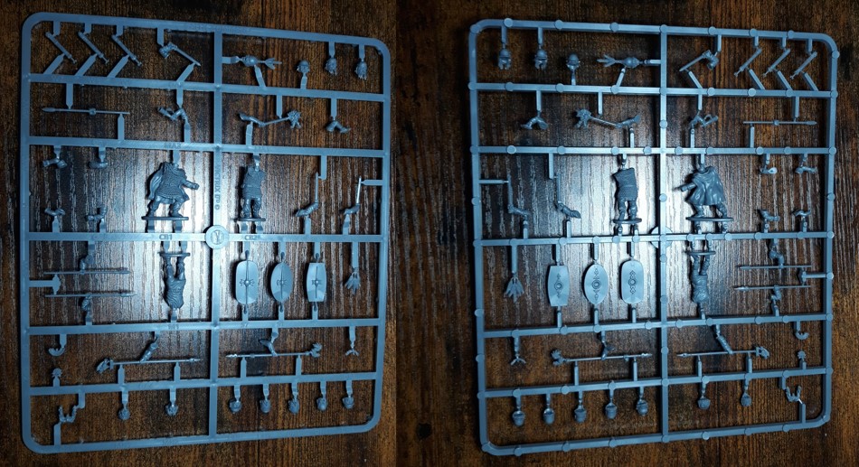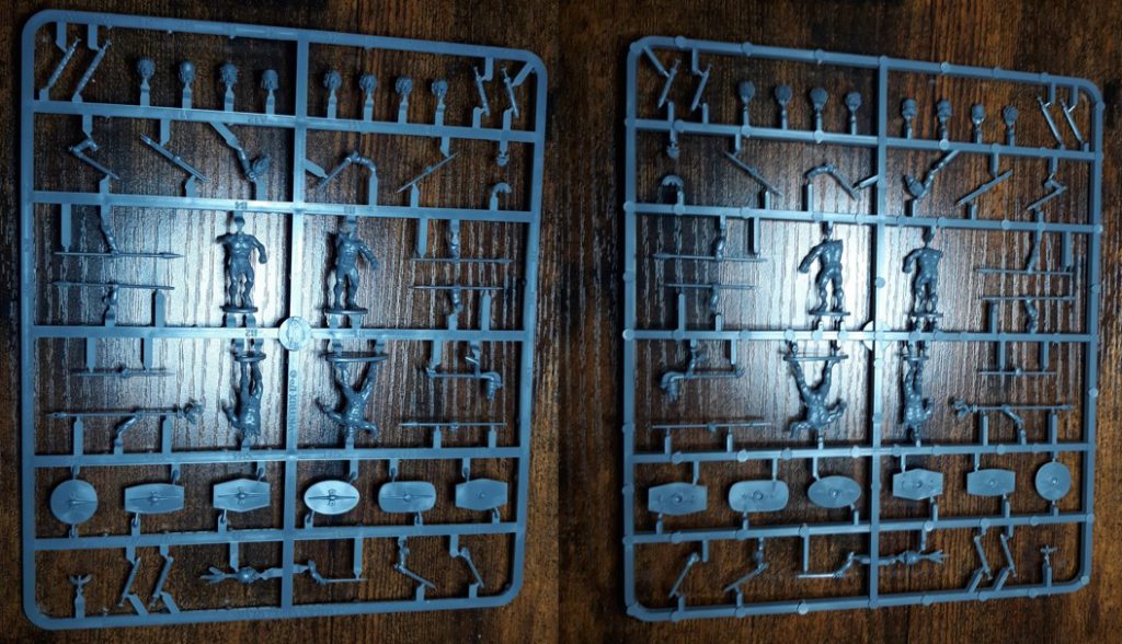 We’re into speculation land again, and the question that inevitably rises is; did they actually fight buck naked? Well yes, not all of them of course, but it was a thing. And a brave thing indeed. It’s not like all Gallic tribes fought in balmy mediterranean climes either, and if you imagine feeling miserable after wearing the wrong coat on a rainy day and coming home drenched from the rain, think of standing for hours in sleet and hail until battle is met, but naked. Showing that you can withstand hardship, and having confidence in your abilities with spear, sword and shield to forego any other armor once again proves how highly these people venerated warrior culture. At this point you would expect some sort of joke or double entendre about genitals, and here it is; there are also plenty of bits on these sprues. You can build 24 warriors, but for obvious reasons capes are not provided here (though you still can use one from other kits if you want). Clad only with a sword belt and some jewellery (not as enticing as it sounds on a screaming Gaul) you can use spears and javelins next to the aforementioned swords. A nice touch is that you get a couple of sets of hands clutching javelins as well in their left hand, not enough to equip an entire band, but it’s a nice attention to detail. Nobody carries just one javelin. There are a couple more unhelmeted heads, all modelled with spiky hair, to simulate the lye and pig’s fat they used in the first ever punk look. You can optionally paint them with the famous blue tattoos, but again, customs between different tribes differed a lot so if you don’t feel like freehanding just add a little sunburn or something.