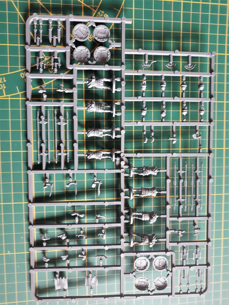 Options are fine. There are no spare head options in either set, and the difference in head options is practically the only thing that sets apart the Athenian and mercenary set. That is also the only Thing I have an issue with. Some more head options would be more than welcome, so if you see a head skittering off into the depths of your shaggy carpet or your dog’s bowels, you’ll probably spend some time on your knees with a lamp looking like some kind of idiot. This is not only a practical issue, as next to the shields, it’s an easy way to diversify your phalanx. The Athenian sprue does have a cloak, so you can use those to spice it up a bit. For weapons, there are three types of swords to choose from (kopis, falcata and xiphos) and you can model up to 4 models per sprue with sword in hand. Spears break, and when the initial push came to an end and the melee started, every hoplite had a sword to get stuck in. There are a couple of different ways to model the spears as well, with options for an “at rest” or more actively engaging pose.