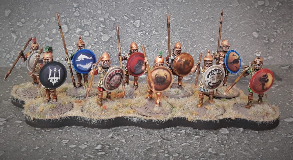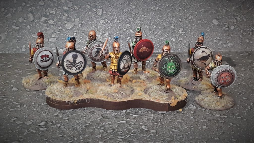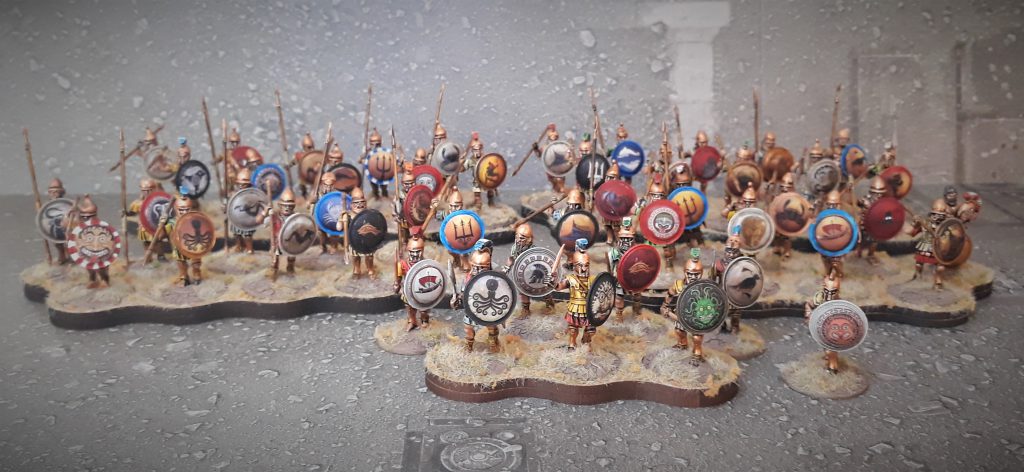 Let’s talk about the period these guys could be seen coming over the horizon in their fancy rowboats with pretty eyes on the sides, and a grim determination to bring some democracy to your bar-bar speaking ass. The suggested time frame these hard men can be used for is 5th- 3rd century BCE, which puts us squarely in the Peloponnesian wars. You have some leeway here of course, but it’s a period of time that pitted these boys against fellow city states, the budding roman empire, Persians, Carthaginians, Thracians, Dacians, Gauls and probably a bunch I’m forgetting here. This box bag will see you through plenty of conflicts. Mercenary life was rewarding in this time as well, as there was pretty much always a conflict going on. As I will be using this kit for a Sicilian mercenary force, I decided to go for the bright colors, representing the fact that they’ve had access to plenty of loot and this should be reflected in their armor and dress. Speaking of which, you have both the classic linothorax and bronze cuirass available, giving another opportunity to differentiate your elite or richer troops from citizens who just used granddad’s stuff. The linothorax gave me some pause. I assembled and painted the warlord games hoplite kit some time ago, and at that time I figured “glued felt over metal maybe, that’s got to look more natural looking”, so painted most of those linothoraxi in more subdued colors, or off-white.