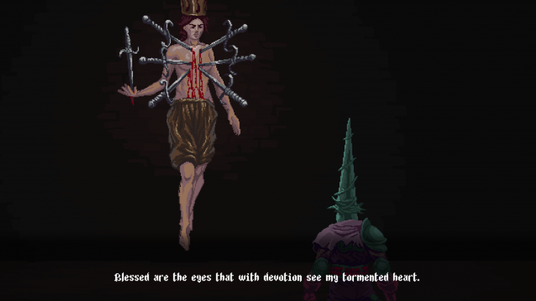 You may recognize him as a perverted Christ from Michelangelo’s Pietà. He climbs off of his Mary, rips her head off, throws it at you, and the fight begins. If you decide to take the branching path the other direction and avoid that boss, you’ll run into a monstrous incarnation of the martyred St. Sebastian. This is the kind of game Blasphemous is.