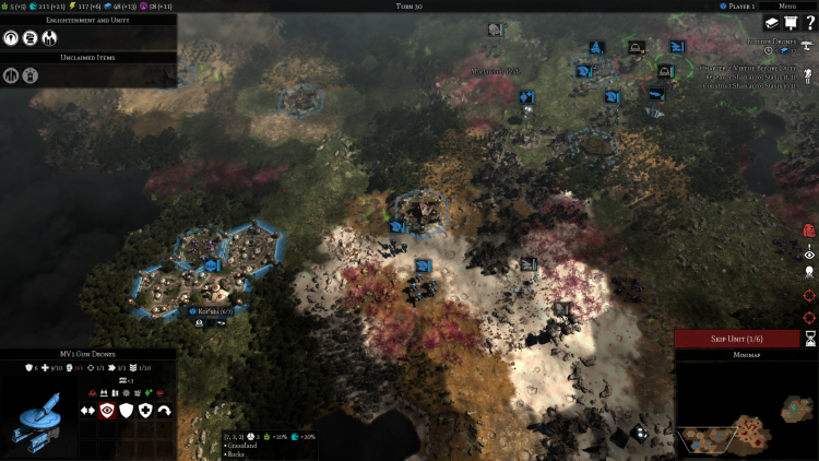 You can see in the top right that I’m engaged in a slog against a couple neutral armies; I’ve been up there for about five turns now, and those are the dents we’ve made in each other. I suspect I’ll still be litigating those outcomes around turn 38. You can see my city is at pop 6/7 but is only occupying 3 squares; this is, again, due to the bottleneck in production. In the lower-middle portion of the screenshot, you can see the bizarre instance of some MV1 Gun Drones presenting as neutral; that’s because the enslaver units can enslave wholly robotic units, which doesn’t make much sense but we’re rolling with it. Those things die quickly.
