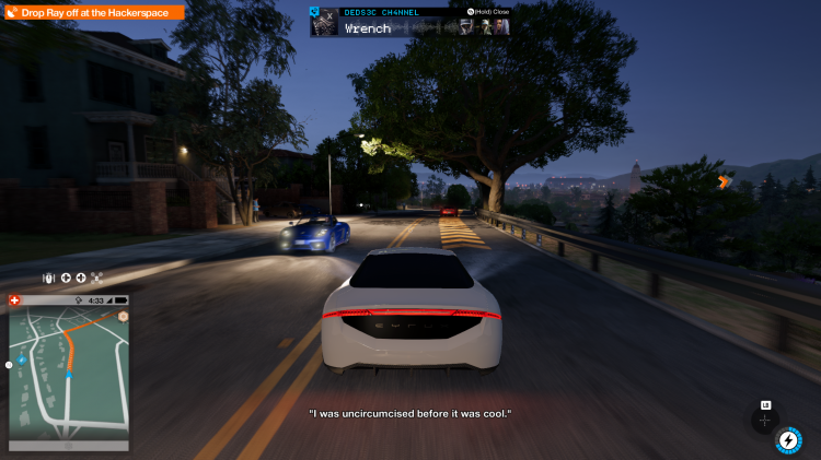 It builds off of the previous game in the series, the slightly differently-named Watch_Dogs, which was in some ways a qualified success, but in many more important ways was an interesting failure. Watch_Dogs somewhat overpromised on its hacking system in pre-launch materials, giving the impression of a much more robust tool-kit of “hack everything” world interaction; when the game came out, there were certainly a number of hacking subsystems that kicked in depending on whether you were on foot or in a car or what have you, but they were very regimented, singular interactions. And the game definitely overpromised on the graphics, because Ubisoft was fool enough to demo it with a lighting engine that never made it into the final product for performance reasons. Perhaps the biggest problem with the game, though, was that the story was hackneyed garbage starring a deeply unlikable man with a deeply unlikeable name who mainly went around abusing people because he was sad his niece was dead, and this excused, say, choking out the female lead the first time they met. Batman knockoffs are tedious enough without running around in a baseball cap and being named Aiden; Watch Dogs 2 moves to a different city and focuses on a different protagonist, and is far better off for it.
