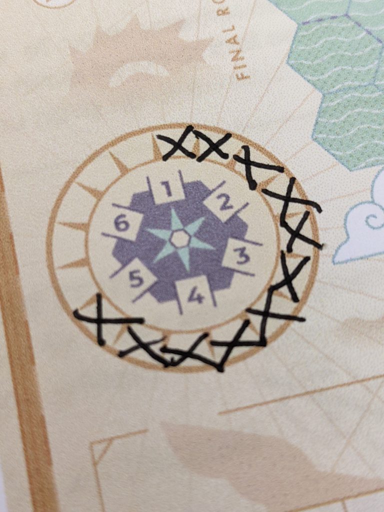 Three six-sided dice are rolled each round, and the results are used by all players. Turns are taken simultaneously as you chart your course and tick off boxes all over your player sheet. Each round you choose two dice for navigating the map and one for your ship. One die determines direction (based on the D6 compass rose).