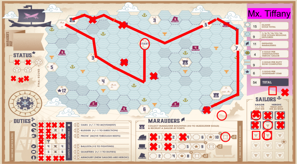 A second die determines your movement; ships must move (based on your chosen directional die) the die’s full amount in a straight line, which you track on your map. Spend the remaining unused die on Duties, a mini-bingo card of 1-6 die values you cross off that trigger bonuses when X’ing out entire rows or columns.