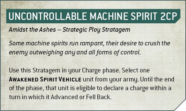 On the vehicle side, you get Uncontrollable Machine Spirit, which is an “advance and charge” or “fallback and charge” stratagem. It’s...not bad, but come on, we’re comparing it to psychic arm wrestling that makes your brain explode. Nothing was going to live up to that. Jack: But Greg, you can shove Chaplain Barbatos in a dreadnought and get him to die in melee faster!