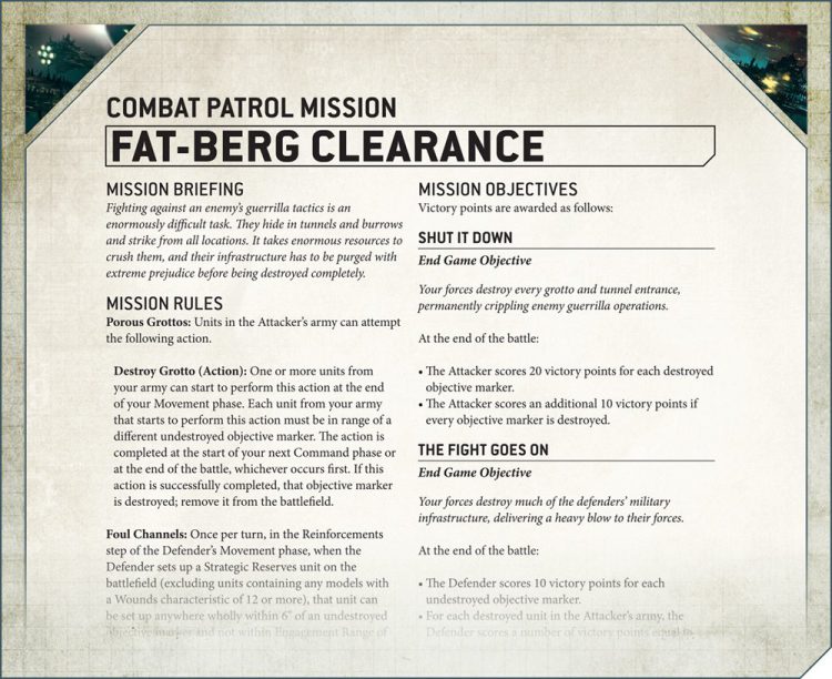 Amidst the Ashes comes packed with a selection of missions for you to try out, with six at each points level. In addition to the Fat-Berg Clearance mission previewed on Warhammer Community, the Combat Patrol missions offer a selection of rules themed around different battlefield locations. Hard Landing sees a landing party that missed their mark desperately trying to break out from behind enemy lines, with opposing forces closing in from both sides. Boarding Action is exactly what it says on the tin, offering you the opportunity to see if your forces can seize control of a key location in one of your opponent’s ships, or to punish them for their hubris in thinking they could take it off of you. Finally, if you want a real fight, look no further than the Meat for the Grinder, where you’ll score points for destroying your enemy units, but there’s a risk - when you destroy something, that unit immediately sets up as though it had arrived from Strategic Reserves.