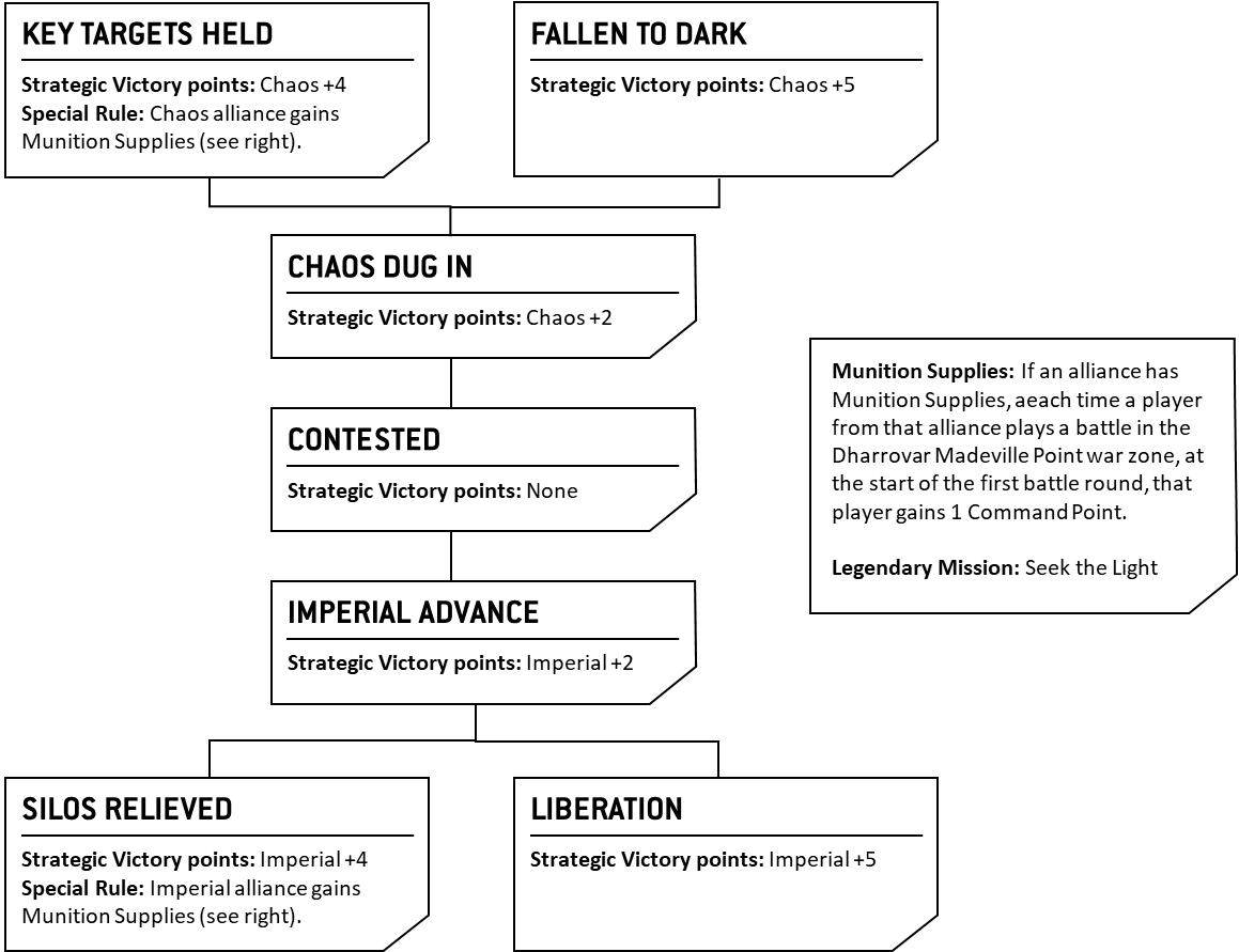 TheChirurgeon: Every one of these books contains a campaign framework and Rift War is no different. The War of Desperation campaign represents the long, grueling conflict over the Nachmund Gauntlet. As with prior campaigns, this one splits players into Imperial and Chaos teams and introduces a new War Zone Tracker mechanic for tracking a team’s success. Players earn War Zone points for their team by playing or winning games, with larger games scoring more points.