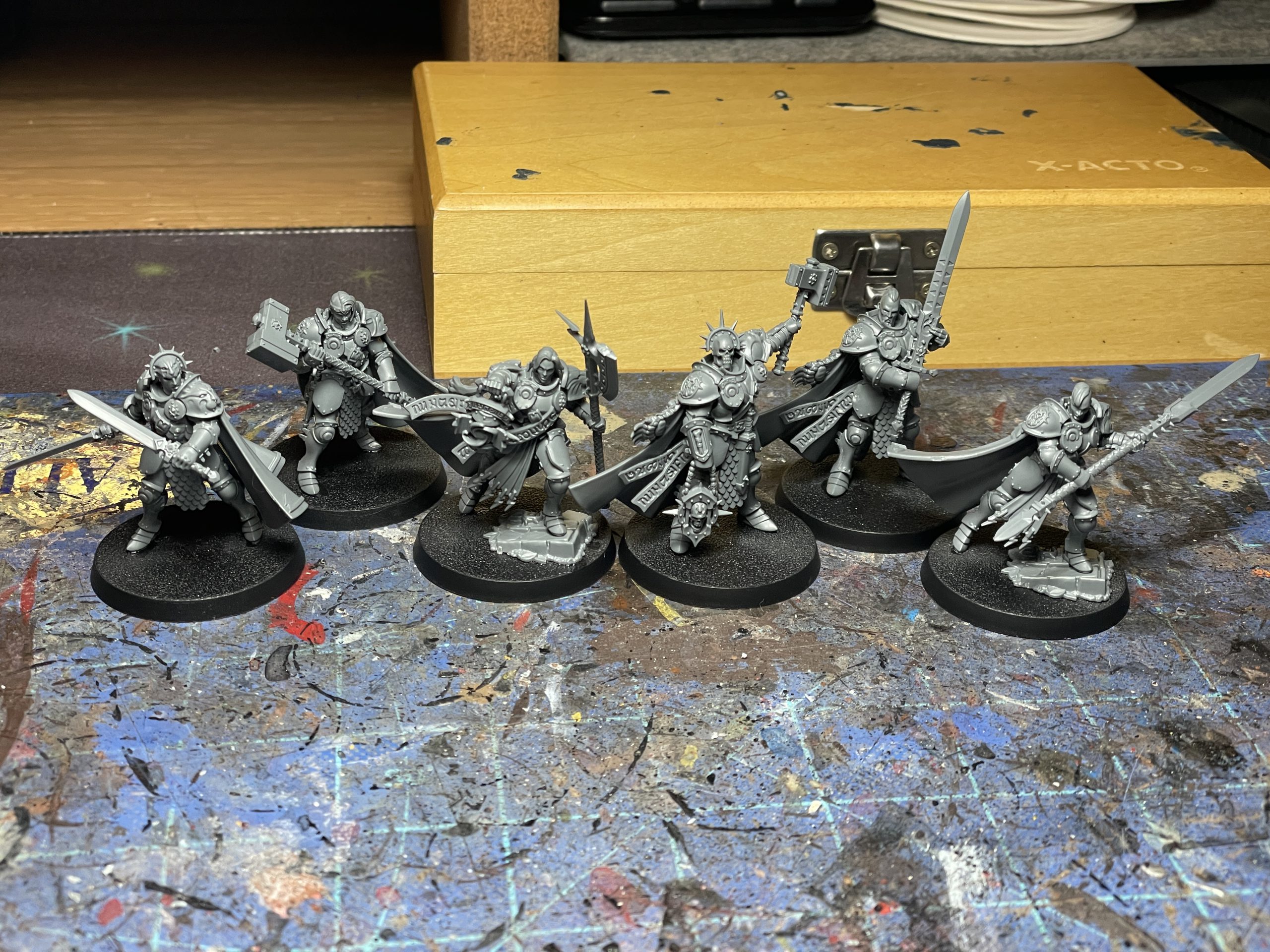 There are 7 different fighters you can build with this kit - a Questor Prime with a halberd and Ghostbusters trap, a Soulsworm Knight-Relictor with a warhammer and skull in a box, an Errant-Questor Duellist (including a superfluous L) with Twinblades, and Errant-Questors with Grandblade, Grandspear, Grandhammer, and Grandaxe options. The poses on these can look a smidge stiff and somewhat repetitive, but by turning the heads on them you can mitigate this to a degree. The heads are all on ball joints and only the plumed and skull heads are tied to a specific character, so you have plenty of freedom in this department. You can't quite tell at first glance, but the bodies are gendered at 2 dudes and 4 ladies, and if you wanted to put either type of head on either type of body you absolutely could.
