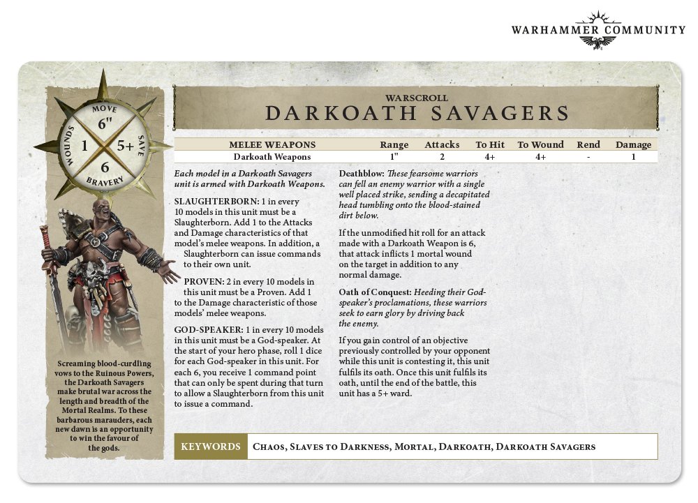 I'm rather surprised at the quality of these guys, traditionally Games Workshop has treated the Warcry and Underworlds models as an obligation. Usually they're not very good and are forgotten. These guys both seem like they have potential, while the Tarantulos is probably a bit too delicate and finicky to see competitive play they are still a unique toolkit to bring to the table. The Darkoath seem potentially competitively viable, even with the drawback of no Mark of Chaos.